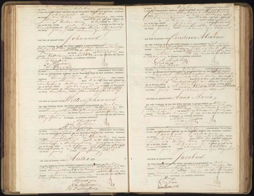 Op heden Zestien Oitober Achttienhonderd Vier-en-Vijftig, is voor ons ondergeteekende Ambtenaar van den Burgerlijken Stand der Stad Amsterdam, verschenen: Johannes de T.Os van beroep winkelier oud zevenentwintig Jaren, wonende Singel Buurt KK. No. 98., walke heeft verklaard, dat op dertien dezer des na middags ten Een ure, in het huis, staande als boven is geboren een Kind van het mannelijke geslacht, uit Geertruda Maria Brands. van beroep geen wonende als boven: zyne Echtgenoot welk Kind zal genaamd worden Johannes. van welke Verklaring bij deze Akte hebben opgemaakt in tegenwoordigheid van rderik Abraham Dekkers van beroep aagdrager oud zevenenveertig Jaren, wonende Haar lemmerdik UU 27ten van Adrianus reede van beroep geen oud vierenviftig Jaren, wonende Oudespiegelstraat K 72 en is deze Akte door ons, benevens den vader en de Getuigen, na voorlezing onderteekend I de os, :D. A: Dekkers. 919 en-Vijftig Op heden Zestien October Achttie, is voor oud ondergeteekende Ambtenaar van den Burgerlijken Stand der Jad Amsterdam verschenen: Christiaan Abraham Messering beroep timmerman oud twee en dertig Jaren, wonende Nieuwstraat Buurt H. No. 540, welke heeft verklaard dat Heden des voormiddags ten zeven ure, in het huis, staande als boven is geboren een Kind van het mannelijke geslacht, uit Antonia Cornelia Cmous. van beroep geen wonende als boven: zijne Echtgenoot welk Kind zal genaamd worden Christiaan Abraham. van welke Verklaring wij deze Akte hebben opgemaakt in tegenwoordigheid van Johannes pristinus van den Berg van beroep konendrager oud vier en dertig Jaren, wonende nieuwstraat 540en van JohannCarl Born van beroep stoffeerder oud zesenvyftig Jaren, wonende als boven H. 540 en is deze Akte voor ous benevens den vader en de Getuigen, na voorlezing onderteekend. „A Messeliug JHG J Cvet Bry 3orn Op heden zestien ditobig Achttienhonderd Vier-en-Vijftig, is voor ons ondergeteekende Ambtenaar van den Burgerlijken Stand der Stad Amsterdam, verschenen: Antje. Gordyn. van beroep voedshouder oud Eenendertig Jaren, wonende Binnengasthuis Buurt B. No. 34, welke heeft verklaard dat inhaar bijzin op dertien dezer des middags ten twaalf. ure, in het huis, staandeals boven is geboren een Kind van het Mannelijke geslacht, uit Susanna Johanna Brandse van beroep dienstbode wonende kleine Wittenbgerstraat S 291. welk kind zal getaamd worden Willem Johannes. van welke verklaring wij deze Akte hebben opgemaakt in tegenwoordigheid van Jacob de Balbian van beroep teppoost oud Eenenveertig Jaren wonende binnengasthuis B34en van Hermanus Dallinghuis van beroep suppaart oud achtentwintig Jaren wonende als boven en is deze Akte door ons, benevens de vangecgsteren de Getuigen, na voorlezing onderteekend. A Gordyn J de Balbiaur 12G9 nghe Op heden Zestien October Achttienhonderd Vier-en-Vitig, is voor ons ondergeteekende Ambtenaar Jaan den Burgerlijken Stand der Stad Gansterdam, verschenen: Hijndert Willebrordus Reimsing van beroep Commissionnair oud Eenendertig Jaren, wonende aagpad Buurt 4Y No. 212., welke heett verklaard dat op veertien dezer des uiddags ten twaallf ure, in het huis, staande als boven is geboren een kind van het vrouwelijke geslacht, uit Francina Carlotta Catharina Schreude van beroep geen wonende als boven: zyne Echtgenoot welk Kind zal genaamd worden Anna Maria van welke Verklaring wij deze Akte hebben opgemaakt in tegenwoordigheid van aldirt Gerardus Helmsing van beroep winkelier oud drieenzestig Jaren, wonende Looyersgracht 1HOH 254. en van Ryn pert Wille brordus schrender van beroep kantoorbediendoud zesentwintig Jaren, wonende Onzachterburgwal G. 270 en is deze Afte door ons, benevens den vader in de Getuigen, na voorlezing onderteekend K. WHeemsing A G Helmstuy R Op heden Zestien October Scnienhonderd Vier-en-Vijtig is voor ons ondergeteekende Ambtenaar van den Burgerlijken Stand der Stad Amsterdam, verschenen: Antje Goudyn van beroep vroedvrogus oud Eenendertig Jaren, wonende Binnengasthuis Buurt 3. No. 34. werte heeft verklaard dat in haar byzym op dertien dezer des na oiddags ten vier ure, in het huis, staande als bouen geboren een Kind vanhe mannelyke geslacht, uit Alida Klarenbeek van beroep geen wonende Treeftsteeg KK. 15. vel kindad getaand voden Antoon. van welke Verklaring wij deze Akte hebben opgemaakt in tegenwoordigheid van Jacob de BBalbiam van beroep sapparst oud Eenenveertig Jaren, wonende binnen gasthuis B34, en van Hermanus Dallinghuis van beroep snippoort, oud achtentwintig Jaren, wonende als haven en is deze Akte door ond benevens de Hangerfsteren de Getuigen, na voorlezing onderteekend A Gordyn J de Belbiaan Pry H Dullinghuis Op heden Z Oitobi Achttienhonderd Vier-en-Vijtig, is voor ons ondergeteekende Ambtenaar van den Bargerlijken Stand der Stad Amsterdam, verschenen: Jacobus Verhagen van beroep winkelier oud vier en twintig Jaren, wonende Merkstraats Buurt BBo. 7555., welke heeft verklaard aan op dertien dezer des voormiddags ten Elf ure, in het huis, staande als boven is geboren een kind van het mannelijke geslacht, uit Johanna Bakker. van beroep geen worende als boven: zijne Echtgenoot. welk Kind zal genaamd worden Jacobus. van welke Verklaring wij deze Akte hebben opgemaakt in tegenwoordigheid van Willem de Vries van beroep blikslager oud veertig Jaren, wonende 1: Batavierdustraat, en van Willem Riman van beroep geen oud vijfentwintig Jaren, wonende waleweestraat BB. 425. en is deze Akte door ons, benevens den vader inn de Getuigen, na voorlezing onderteekend. J: verhager. W. De Vries 11W9 wertamsing