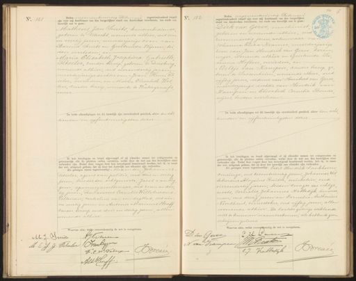 No. 121 Heden negenentwintig Februari negentienhonderd twaalf zijn voor mij Ambtenaar van den burgerlijken stand van Amsterdam verschenen, ten einde een huwelijk aan te gaan: Matheus Jan Smits kantoorbediende geboren te Utrecht wonende alhier oud een en veertig jaren, meerderjarige zoon van Barend Smits en Geertruida Wijnen bei den overleden en Maria Elisabeth Josephina Gabrielle Titseler zonder beroep, geboren te Doesburg wonende alhier, oud vierendertig jaren meerderjarige dochter van Jean Henri Tis seler, overleden, en Maria Elisabeth Wel ters, zonder beroep, wonende te Watergraafs meer. De beide afkondigingen tot dit huwelijk zijn onverhinderd geschied, alhier den acht tienden en vyfentwintigsten dezer.— Ik heb bruidegom en bruid afgevraagd of zij elkander nemen tot echtgenooten en getrouwelijk alle de plichten zullen vervullen, welke door de wet aan den huwelijken staat verbonden zijn. Nadat deze vragen door hen bevestigend beantwoord werden, heb ik, in naam der wet, uitspraak gedaan, dat zij door het huwelijk aan elkander zijn verbonden. Als getuigen waren tegenwoordig: Alexander Johannes. Titseler, agent van politie oud drie en dertig jaren, broeder der echtgenoote, Jacob van Log gem spoorwegambtenaar, oud zeven en der„ tig jaren, Franciscus Cornelis Willebrordus Veltman controleur, aan een dagblad oud vier en veertig jaren en Antonie Marinus Heuff zonder beroep, oud drie en dertig jaren, allen wonende alhier. ele overeen tomstig de wet is voorgelezen. No. 122 Heden negenentwintig Februari negentienhonderd twaalf zijn voor mij Ambtenaar van den burgerlijken stand van Amsterdam verschenen, ten einde een huwelijk aan te gaan: Dirk van Gerve, machinist, 39.1 geboren en wonende alhier, oud 292 zevenen dertig jaren weduwnaar van Johanna Eliza Kramer meerderjarige zoon van Jan Hendrik van Gerve, koren, weger, wonende alhier en Geertruida Su„ sanna Hofboer, overleden, en Neeltje van Kampen zonder beroep, ge„ boren te Sassenheim, wonende alhier, oud vijftig jaren, weduwe van Huibert van Gerve meerderjarige dochter van Hendrik van Kampen en Elisabeth Cornelia Boude wijns, beiden overleden. De beide afkondigingen tot dit huwelijk zijn onverhinderd geschied, alhier den acht tienden en vijfentwintigsten dezer Ik heb bruidegom en bruid afgevraagd of zij elkander nemen tot echtgenooten en getrouwelijk alle de plichten zullen vervullen, welke door de wet aan den huwelijken staat verbonden zijn. Nadat deze vragen door hen bevestigend beantwoord werden, heb ik, in naam der wet, uitspraak gedaan, dat zij door het huwelijk aan elkander zijn verbonden. Als getuigen waren tegenwoordig: Evert Hendrik Lankhoorn concierge, oud zesentwintig jaren, Johannes Wil lebrordus Aloysius Ruiter, winkelier oud vierendertig jaren beiden zwager des echtge noots, Cornelis Johannes Kabbedijk timmer man, oud dertig jaren en Cornelis Anthonius Noordhout, vnurstoker, oud vijftig jaren, allen wonende alhier. De laatste getuige verklaarde niet te kunnen naamteekenen, als hebbende geen schrijven geleerd Waarvan akte, welke overeenkomstig de wet is voorgelezen. M. J. SmitsWWitue M. E. J. G. TitulerTvanhoggen Brevee F C. W. Vering Al Heuff H Cenner D. San Gerrie N. van Trampen WRiter BBrevel C.J. Kabbedijk