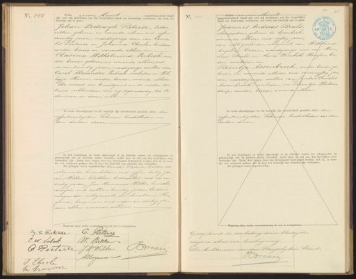 No 2 140 Heden zeven Maart negentienhonderd twaalf zijn voor mij Ambtenaar van den burgerlijken stand van Amsterdam verschenen, ten einde een huwelijk aan te gaan: Johan Lodewijk Pieterse, letter„ zetter, geboren en wonende alhier, oud vijfen„ twintig jaren, meerderjarige zoon van Corne„ lis Pieterse en Johanna Eberle, beiden zonder beroep en wonende alhier en Clasina Wilhelmina Verbeek, zon„ der beroep, geboren en wonende alhier, oud drieëntwintig jaren, meerderjarige dochter van Carel Alexander Verbeek, overleden en Hil„ ligje Hoorn, zonder beroep, wonende alhier. De ouders des bruidegoms en de moeder der bruid verklaarden, voor mij tegenwoordig, toe te stemmen in dezen echt.- De beide afkondigingen tot dit huwelijk zijn onverhinderd geschied, alhier den vijfentwintigsten Februari laatstleden en den derden dezer. Ik heb bruidegom en bruid afgevraagd of zij elkander nemen tot echtgenooten en getrouwelijk alle de plichten zullen vervullen, welke door de wet aan den huwelijken staat verbonden zijn. Nadat deze vragen door hen bevestigend beantwoord werden, heb ik, in naam der wet, uitspraak gedaan, dat zij door het huwelijk aan elkander zijn verbonden. Als getuigen waren tegenwoordig: Cornelis Pieterse, broeder des echtgenoots, huisschilder, oud vijf en dertig ja„ ren, Willem Bekker, bootwerker, oud zes en dertig jaren, Jan Hermanus Wilke, handels„ reiziger, oud acht en twintig jaren, beiden zwager der echtgenoote en Arnoldus Ho„ gema, koopman, oud negen en dertig ja„ ren, allen wonende alhier. No. Heden reven Maart stand van Lusterdam verschenen, ten einde een huwelijk aan te gaan Joannes Andreas Bruls, zilverpoetser, geboren te Spanbeek; wonende alhier, oud vijftig jaren; van echt gescheiden echtgenoot van Wilhelmina Angeliea Croin, meerderjarige zoon van Hen„ ricus Bruls, en Maria Elisabeth Henssen, bei„ den overleden en Reintje Assenbroek, zonder beroep, ge„ boren en wonende alhier, oud eenenvijftig ja„ ren, meerderjarige dochter van Jacobus Cornelis Assenbroek, overleden en Reintje Westen„ dorp, zonder beroep, wonende alhier. De beide afkondigingen tot dit huwelijk zijn opverhinderd geschied, alhier den vijfentwintigsten Februari laatstleden en den derden dezer. Ik heb bruidegom en bruid afgevraagd of zij elkander nemen tot echtgenooten en getrouwelijk alle de plichten zullen vervullen, welke door de wet aan den huwelijken staat verbonden zijn. Nadat deze vragen door hen bevestigend beantwoord werden, heb ik, in naam der wet, uitspraak gedaan, dat zij door het huwelijk aan elkander zijn verbonden. Als getuigen waren tegenwoordig: wet is voor is voorgelezen. a. E. Pieterie C: Peterse C W Verbeek. W. Bepker Brevee C Pieter JH Wilke HHogens I Eberle khoorn Goedgekeurd de doorhaling dezer bladzijde; wegens abusieve beschrijving. De Ambtenaar van den Burgerlijken Stand, Brevee