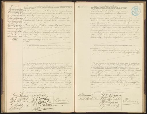 No. 153 Bij vonnisder Avron diesements-Rechtbank te Amsterdam, van zeven en twintig Octo ber negentienhonderd twee en twintig is uitge sproken de ontbuiding door echtscheiding van het in nevensstaande akte vermelde huwe¬ lijk Ingeschreven in het register van Huwre lijken en Echtscheidingen mumner een a, folio veer en veertig verso te Amsterdam, heden veertien Augustus negentienhonderd. Drie en twintig. Aahz Heden veertien Maart negentienhonderd twaalf zijn voor mij Ambtenaar van den burgerlijken stand van Amsterdam verschenen, ten einde een huwelijk aan te gaan: „& Pieter van Klaveren, wijnkoopers„ knecht, geboren en wonende alhier, oud zes en twintig jaren, meerderjarige zoon van Johannes Jacobus van Klaveren, boot nwerker en Anna Berkhoud, zonder beroep, beiden wonende alhier en Marritje Johanna Swart, zonder beroep, geboren en wonende alhier, oud zeven „en twintig jaren; meerderjarige dochter van Lammert Swart, spoorwegambtenaar en Mar„ ritje Nickel, zonder beroep, beiden wonende alhier. Beider ouders verklaarden, voor mij tegenwoordig, toe te stemmen in dezen Acht. De beide afkondigingen tot dit huwelijk zijn onverbinderd geschied, alhier den derden en tienden dezer. Ik heb bruidegom en bruid afgevraagd of zij elkander nemen tot echtgenooten en getrouwelijk alle de plichten zullen vervullen, welke door de wet aan den huwelijken staat verbonden zijn. Nadat deze vragen door hen bevestigend beantwoord werden, heb ik, in naam der wet, uitspraak gedaan, dat zij door het huwelijk aan elkander zijn verbonden. Als getuigen waren tegenwoordig: Gerrit Lambertus Swart. broeder der echtgenoote, instrumenthandelaar, oud een en dertig jaren, wonende te Naarden. Lambertus Swart, broeder der echtgenoote, kan„ toorbediende, oud een en twintig jaren, Cornelis Frederikus van Klaveren, oom des echtge„ noots, koffiehuishouder, oud negen en veertig jaren en Cornelis Cramer, spoorwegambtenaar, oud twee en twintig jaren, allen wonende al„ hier. Waarvan akte, welke overeenkomstig de wet is voorgelezen. No. 154 Heden veertien Maart. negentienhonderd twaalf zijn voor mij Ambtenaar van den burgerlijken stand van Amsterdam verschenen, ten einde een huwelijk aan te gaan: Frederius Bruinsma. timmerman, geboren te Leeuwar„ den, wonende alhier, oud negen en dertig jaren, van echt gescheiden echtgenoot van Rosalia van Maarin, meerderjarige zoon van Sybren Bruinsma en Antje Kok„ beiden overleden en Anna Hermina Brokholm, zonder beroep, geboren en wonende alhier, oud vijf en dertig jaren, meerderjarige dochter van Hendrik Brokholm, overleden en Maria Dorathea Jorissen, strijkster, wonende alhier. De beide afkondigingen tot dit huwelijk zijn onverhinderd geschied, alhier den derden en tienden dezer. De bruidegom verklaarde mij zijne identiteit wegens naamsverschil in de overgelegde stukken Ik heb bruidegom en bruid afgevraagd of zij elkander nemen tot echtgenooten en getrouwelijk alle de plichten zullen vervullen, welke door de wet aan den huwelijken staal verbonden zijn. Nadat deze vragen door hen bevestigend beantwoord werden, heb ik, in naam der wet, uitspraak gedaan, dat zij door het buwelijk aan elkander zijn verbonden Als getuigen waren tegenwoordig: Willim Frederik Snijders, oud een en vijftig jaren, Johannes Engelbertus Josephus Bronshoff, zwager des echtgenoots, oud vijf en dertig jaren, beiden werkman van beroep en wonende alhier; Hermanus Jacob Loggen, zonder beroep, oud zeventig jaren, wonende te Hilversum en Petrus Jacobus Bronshoff, kleermaker, oud zeven en twintig jaren, wonen