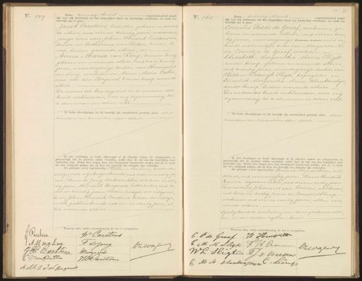 No. 159 Heden twintig Maart negentienhonderd twaalf zijn voor mij Ambtenaar van den burgerlijken stand van Amsterdam verschenen, ten einde een huwelijk aan te gaan: Jacob Carstens besteller, geboren en wonen„ de alhier, oud vier en twintig jaren, meerder„ jarige zoon van Johan Hendrik Carstens win kelier en Catharina van Putten, zonder be roep, beiden wonende alhier, en Anna Maria van Ling, zonder beroep geboren en wonende alhier oud zes en twintig jaren, meerderjarige dochter van Hermanus van Ling, overleden en Anna Maria Catha rina van den Bogaart zonder beroep, wonende alhier. De ouders des bruidegoms en de moeder-der bruid verklaarden, voor mij tegenwoordig, toe te stemmen in dezen echt: De beide afkondigingen tot dit huwelijk zijn onverbinderd geschied, alhier den tienden en zeventienden dezer. Ik heb bruidegom en bruid afgevraagd of zij elkander nemen tot echtgenooten en getrouwelijk alle de plichten zullen vervullen, welke door de wet aan den huwelijken staat verbonden zijn. Nadat deze vragen door hen bevestigend beantwoord werden, heb ik, in naam der wet, uitspraak gedaan, dat zij door het huwelijk aan elkander zijn verbonden. Als getuigen waren tegenwoordig: Willem Carstens broeder des echtgenoots, wijnkoopersknicht oud twee en veertig ja ren, Frans de Jong, boekdrukker oud twee en der tig jaren, Hendrik Boogaard letterzetter, oud ze ven en twintig jaren beiden zwager der echtgenoo„ te en Johan Hendrik Carstens, broeder des echtge noots, pakhuisknecht oud een en veertig jaren, al len wonende alhier. Waarvan akte, welke overeenkomstig de w No. 160 Heden twintig Maart negentienhonderd twaalf zijn voor mij Ambtenaar van den burgerlijken stand van Amsterdam verschenen, ten einde een huwelijk aan te gaan: Cornelis Fedde de Graaf, werkman, ge boren en wonende -alhier, - oud vier en twin tig jaren, meerderjarige zoon van niet er kende natuurlijke zoon van Margrieta Ali da Cornelia de Graaf, overleden en Elisabeth Margaretha Maria Sligte zonder beroep, geboren en wonende alhier oud twintig jaren, minderjarige dochter van Willem Lodewijk Sligte, kopergieter en Elisabeth Margaretha Maria Blankenstijn zonder beroep, beiden wonende alhier. De ouders der bruid verklaarden, voor mi tegenwoordig, toe te stemmen in dezen echt„ De beide afkondigingen tot dit huwelijk zijn onverhinderd geschied, alhier -den tienden en zeventienden dezer Ik heb bruidegom en bruid afgevraagd of zij elkander nemen tot echtgenooten en getrouwelijk alle de plichten zullen vervullen,: welke door de wet aan den huwelijken staat verbonden zijn. Nadat deze vragen door hen. bevestigend beantwoord werden, heb ik, in naam der wet, uitspraak gedaan, dat zij door het huwelijk aan elkander zijn verbonden. Als getuigen waren tegenwoordig: Barend Hendriksen met selaar, oud eenenvijftig jaren, Frans Hendrik Cramer, sigarenmaker, oud drie en zestig jaren Franciscus Johannes van Veersen werkman oud twee en zestig jaren en Cornelis Lomp„ werkman, oud een en veertig jaren, allen wo nende alhier. Goedgekeurd de doorhaling van twee geschreven woor„ den in den zesden regel van boven: aarvan akte, welke overeenkomstig de wet is voorgelezen. Waarvan akte, welke overeenkomstig de wet is voorgelezen. W Carstens JJ. Carstens. J A M van Ling F deJong OZwegken J H Cxrsten H Boogjaard E Van Bertlen JH Carsten H de C Vol Begamdt JUlgelbm. C. F de Graaf B Hendieken E M M sligte Tv Eram Vawagtering 2 L Sligte FJ. v. Veersen E M M StankerstynLeomp