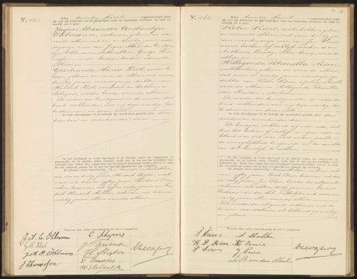 No. 161 Heden twintig Maart negentienhonderd twaalf zijn. voor mij Ambtenaar van den Burgerlijken stand van Amsterdam verschenen, ten einde een huwelijk aan te gaan: Jaques Alexander Constantijn Ohlmann, werkman, geboren en wo„ nende alhier, oud een en twintig jaren, meer„ derjarige zoon van Jaques Alexander Constan„ tijn Ohlmann, stalknecht en Geertje Theu„ nissen, zonder beroep, beiden wonende alhier en Geertruida Maria Rist, zonder be„ roep, geboren en wonende alhier, oud eenen„ twintig jaren, meerderjarige dochter van Hendrik Kist, overleden en Catharina schepers, zonder beroep, wonende alhier. De ouders des bruidegoms en de moeder der bruid verklaarden, voor mij tegenwoordig, toe te stemmen in dezen echt. De beide afkondigingen tot dit huwelijk zijn onverhinderd geschied, alhier den tienden en zeventienden dezer. Ik heb bruidegom en bruid afgevraagd of zij elkander nemen tot echtgenooten en getrouwelijk alle de plichten zullen vervullen, welke door de wet aan den huwelijken staat verbonden zijn. Nadat deze vragen door hen bevestigend beantwoord werden, heb ik, in naam der wet, uitspraak gedaan, dat zij door het huwelijk aan elkander zijn verbonden. Als getuigen waren tegenwoordig: Jan Servoort, suikerbakker, oud vier en dertig jaren, Hendrik Stigter, werk man, oud twee en vijftig jaren, Theodorus Bru„ scker, koopman, oud vijf en zestig jaren en Fre„ drik Hendrik Muller, werkman, oud twee en veertig jaren, allen wonende alhier. No. 162 36 Heden twintig Maart negentienhonderd twaalf zijn voor mij Ambtenaar van den burgerlijken stand van Amsterdam verschenen, ten einde een huwelijk aan te gaan: Pieter Prins, suikerbakker, geboren en wonende alhier, oud zes en twintig ja„ ren, meerderjarige zoon van Jan Prins wiens bestaan of verblijf onzeker is en Anthonia Vermey, zonder beroep, wonende alhier en Hillegonda Petronella Rison winkelierster, geboren en wonende alhier. oud zeven en twintig jaren, meerderjarige dochter van Pieter Rison, wynkoopersknecht wonende alhier en Hillegonda Petronella van Heusden, overleden. De moeder des bruidegoms en de vader der bruid verklaarden, voor mij tegenwoordig, toe te stemmen in dezen echt. De beide afkondigingen tot dit huwelijk zijn onverhinderd geschied, alhier den tienden en zeventienden dezer De bruidegom verklaarde mij onder eede, dat hem het bestaan of verblijf van zijnen vader on„ bekend is en dat deze moet worden geacht, in de onmogelijkheid te zijn, zijn wil ten opzichte van dit huwelijk te verklaren Ik heb bruidegom en bruid afgevraagd of zij elkander nemen tot echtgenooten en getrouwelijk alle de plichten zullen vervullen, welke door de wet aan den huwelijken staat verbonden zijn. Nadat deze vragen door hen bevestigend beantwoord werden, heb ik, in naam der wet, uitspraak gedaan, dat zij door het huwelijk aan elkander zijn verbonden. Als getuigen waren tegenwoordig: Arend Mulder, werkman, oud zes en vijftig jaren, Dirk Buis, koopman, oud drie en zestig jaren, Jan Prins, broeder des echtgenoots werkman, oud acht en dertig jaren en Laurens Bastiaan van der Mel, melkslijter, oud zeven en veertig jaren, allen wonende alhier De moeder des echtgenoots verklaarde niet te kunnen naamteekenen, als hebbende geen schrij„ ven geleerd. Waarvan akte, welke overeenkomstig de wet is voorgelezen. Waarvan akte, welke overeenkomstig de s voorgelezen. J. A. C. Ohtmann C Schyurs J. C Vervoort Onwater G. M. Kert JA. E Chlman H. Stigter T Bruzever J Thengessen T: Seltule W. metig de wet is voorgelezen. AArins At Hulder H P Risen D Buis bawakerig P Kisen J. Rins. L R van der Abel
