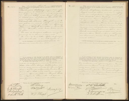 No. 165 Heden twintig Maart negentienhonderd twaalf zijn voor-mij Ambtenaar van den Burgerlijken stand van Amsterdam verschenen, ten einde een huwelijk aan te gaan: Bastiaan Schaaij, sergeant der infan terie, geboren te Rotterdam, wonende alhier, oud acht en twintig jaren, meerderjarige zoon van Francois Schaay, zonder beroep, wonende te Rotterdam en Johanna Elisabeth Be„ geer, overleden en Elisabeth Maria Vleugel, zonder be„ roep, geboren en wonende alhier, oud zes en twin„ tig jaren, meerderjarige -dochter van Wijnandus Johannes Vleugel, huisschilder en Anna Ma„ ria van straaten, zonder beroep, beiden wonen„ de alhier. De vader des bruidegoms verklaarde, voor mij te„ genwoordig, toe te stemmen in dezen echt. De ouders der bruid hebben, blijkens hierbij overge„ legde authentieke akten, in dezen echt toegestemd. De beide afkondigingen tot dit huwelijk zijn onverhinderd geschied, alhier den tienden en zeventienden dezer Ik heb bruidegom en bruid afgevraagd of zij elkander nemen tot echtgenooten en getrouwelijk alle de plichten zullen vervullen, welke door de wet aan den huwelijken staat verbonden zijn. Nadat deze vragen door hen bevestigend beantwoord werden, heb ik, in naam der wet, uitspraak gedaan, dat zij door het huwelijk aan elkander zijn verbonden. Als getuigen waren tegenwoordig: François Schaaij, machinist, oud een en dertig jaren, wonende te Rotterdam, Pieter Bernardus Schaaij, boekhandelaar, oud vier en dertig jaren, wonende te ’s Gravenhage„ beiden broeder des echtgenoots; Jacobus, Lam„ bertus Maria Valk, smid, oud zes en veertig jaren en Wijnandus Johannus Vleugel, broeder der echtgenoote, schoenmaker, oud twee en twintig jaren, beiden wonende alhier.- mstig de wet is voorgelezen. No. 166 Heden eenentwintig Maart negentienhonderd twaalf zijn voor mij Ambtenaar van den burgerlijken stand van Amsterdam verschenen, ten einde een huwelijk aan te gaan: Fredrik Meijboom, boekhouder, geboren te Meppel wonende alhier, oud vier en vijftig jaren, van echtgescheiden echtgenoot van Ja„ coba Hendrika Maria Berghuijs, meerderja rige zoon van Harm Meijboom Janszoon en Temmigje Tuin beiden overleden en Wilhelmina van Hees, zonder beroep, ge boren en wonende alhier, oud zeven en der tig jaren, van echtgescheiden echtgenoote van Wenceslaus Johannes Maria ten Brink, meerderjarige dochter van Jaco„ bus van Hees, kleermaker en Margrieta van Leeuwen zonder beroep, beiden wo- nende alhier. De beide afkondigingen tot dit huwelijk zijn onverhinderd geschied, alhier - den tienden en zeventienden dezer Ik heb bruidegom en bruid afgevraagd of zij elkander nemen tot echtgenooten en getrouwelijk alle de plichten zullen vervullen, welke door de wet aan den huwelijken staat verbonden zijn. Nadat deze vragen door hen bevestigend beantwoord werden, heb ik, in naam der wet, uitspraak gedaan, dat zij door het huwelijk aan elkander zijn verbonden. Als getuigen waren tegenwoordig: Johannes Willem Panbak ker werkman, oud vyfenzestig jaren, Cornelis Hermanus Bouer, werkman, oud acht en dertig jaren, Johannes Sprengers, oud een en zestig jaren en Jacobus Bernardus Loeffen, oud zeven en veertig jaren, beiden werkman van beroep, allen wonende alhier rvan akte, welke overeenkomstig de we Waarvan akte F. Schaaij Bcherai PB Schaa E. M. Vleugel VZwortedug H Schruy vo/a a/ Vleugel J. L M Valk rvan akte, wor reenkomstig de wet is voorgelezen. Glieejkoom. JW Paubakler Baen W Van Heer J Serenzer Brevee LB Loeffer