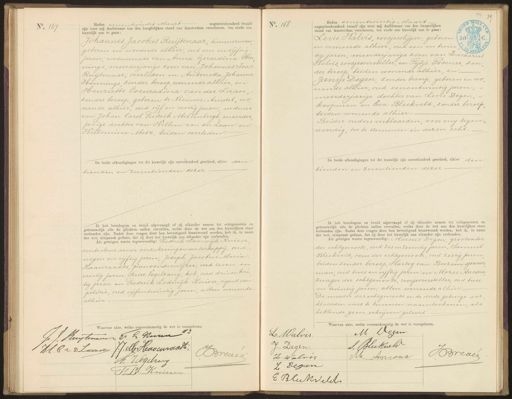 No. 167 Heden eenentwintig Maart negentienhonderd twaalf zijn voor mij Ambtenaar van den burgerlijken stand van Amsterdam verschenen, ten einde een huwelijk aan te gaan: Johannes Jacobus Ruijtenaar, timmerman, geboren en wonende alhier oud een en vijftig- jaren weduwnaar van Anna Gerardina Hen„ nings meerderjarige zoon van Johannes Isac Ruijtenaar, overleden en Antonetta Johanna Hennings, zonder beroep wonende alhier, en Henriette Coenradina van der Laan„ zonder beroep, geboren te Nieuwer Amstel, wo„ nende alhier, oud vijf en veertig jaren weduwe van Johan Carel Fredrik Mellenbergh meerder jarige dochter van Willem van der Laan en Willemina Metz, beiden overleden. De beide afkondigingen tot dit huwelijk zijn onverhinderd geschied, alhier den tienden en zeventienden dezer Ik heb bruidegom en bruid afgevraagd of zij elkander nemen tot echtgenooten en getrouwelijk alle de plichten- zullen vervullen, welke door de wet aan den huwelijken staat verbonden zijn. Nadat deze vragen door hen bevestigend beantwoord werden, heb ik, in naam der wet, uitspraak gedaan, dat zij door het huwelijk aan elkander zijn verbonden Als getuigen waren tegenwoordig: Frederik Lodewik Kniese controleur eener verzekeringsmaatschappij, oud negen en vijftig jaren, Joseph Jacobus Maria. Haanraadts, panvonderwijzer, oud zeven en veertig jaren, Peitse Jogelzang, kok oud drie en twin tig jaren en Frederik Lodewijk Kniese, agent van politie, oud vijfentwintig jaren, allen wonende alhier. WS L Vegtnt No. 168 Heden eenentwintig Maart. negentienhonderd twaalf zijn voor mij Ambtenaar van den burgerlijken stand van Amsterdam verschenen, ten einde een huwelijk aan te gaan: Levie Halvis, roosjesslijper, geboren (59:2 en wonende alhier, oud een en twin„0 tig jaren, meerderjarige zoon van Lacharias Walvis, roosjesversteller, en Pijtje Posener, zon„ der beroep beiden wonende alhier, en Jansje Degen, zonder beroep, geboren en wo nende alhier, oud eenentwintig jaren; meerderjarige dochter van Levie Degen koopman en Eva Bleekveld, zonder beroep beiden wonende alhier.— Beider ouders verklaarden, voor mij tegen„ woordig, toe te stemmen in dezen echt. De beide afkondigingen tot dit huwelijk zijn onverhinderd geschied, alhier den tienden en zeventienden dezer: Ik heb bruidegom en bruid afgevraagd of zij elkander nemen tot echtgenooten en getrouwelijk alle de plichten zullen vervullen, welke door de wet aan den huwelijken staat verbonden zijn. Nadat deze vragen door hen bevestigend beantwoord werden, heb ik, in naam der wet, uitspraak gedaan, dat zij door het huwelijk aan elkander zijn verbonden. Als gebuigen waren tegenwoordig: Marcus Degen, grootvader der echtgenoote, oud zes en zeventig jaren, Samuel Bleekveld, oom der echtgenoote, oud zestig jaren beiden zonder beroep, Hartog van Beezem, sjouwer man, oud twee en vijftig jaren en Mozes Ancona zwager der echtgenoote, roosjesversteller, oud twee en twintig jaren, allen wonende alhier, De moeder des echtgenoots en de derde getuige ver klaarden niet te kunnen naamteekenen, als hebbende geen schryven geleerd. Waarvan akte, welke overeenkomstig de wet is voorgelezen. Waarvan akte, welke overeenkomstig de wet is voorgelezen. G J: Ruitenaam F L Kurn H. Er. v Zaan J: J: M Henocurscash Brevel H Vogelrang JP Knieze M Dezen L. Walvis. S. Bleekueld J: Degen. Brevee L. Walveg M Aniona L Dezeen E Blekveldt