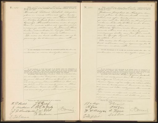 No. 180 Heden acht en twintig Maart negentienhonderd twaalf zijn voor mij Ambtenaar van den burgerlijken stand van Amsterdam verschenen, ten einde een huwelijk aan te gaan: Hendrik Petrus Riebel, lettergieter, geboren en wonende alhier, oud vijf en twintig jaren, meerderjarige zoon van Petrus Riebel, en Neeltje de Groot, beiden overleden en- Grietje Woudhuizen, zonder beroep, ge boren en wonende alhier, oud negentien jaren. minderjarige dochter van Jan Douwes Woud, huizen, veemarbeider en Trijntje Tolman; zonder beroep, beiden wonende alhier. De ouders der bruid verklaarden, voor mij te„ genwoordig, toe te stemmen in dezen echt.- De beide afkondigingen tot dit huwelijk zijn onverhinderd geschied, alhier den ze„ ventienden en vier en twintigsten dezer. Ik heb bruidegom en bruid afgevraagd of zij elkander nemen tot echtgenooten en getrouwelijk alle de plichten zullen vervullen, welke door de wet aan den huwelijken staat verbonden zijn. Nadat deze vragen door hen bevestigend beantwoord werden, heb ik, in naam der wet, uitspraak gedaan, dat zij door het huwelijk aan elkander zijn verbonden. Als getuigen waren tegenwoordig: Jacobus Petrus Riebel, broe„ der des echtgenootes, lettergieter, oud negen- en twin„ tig jaren, Hendrik Karme de Groot, huisknecht oud dertig jaren, Johannes Wilhelmus Vlek, zon der beroep, oud een en zeventig jaren en Klads Woudhuizen, broeder der echtgenoote, timmerman, oud drie en twintig jaren, allen wonende alhier.- No. 181 Heden acht en twintig Maart negentienhonderd twaalf zijn voor mij Ambtenaar van den burgerlijken stand van Amsterdam verschenen, ten einde een huwelijk aan te gaan: Judocus Josephus de Maaijer, trein„ smid, geboren te Nieuwer-Amstel, wonende alhier, oud vijf en twintig jaren, meerderjari„ ge zoon van Jan Francies de Maaijer, grond, werker en Antonetta D Hont, zonder beroep, beiden wonende alhier en Maria Grin, zonder beroep, geboren en wonende alhier, oud drie en twintig jaren; meerderjarige dochter van Jan Grin, overle„ den en Grietje Keijzer, zonder beroep, wonen de alhier. De ouders des bruidegoms en de moeder der bruid verklaarden, voor mij tegenwoordig, toe te stemmen in dezen echt.- De beide afkondigingen tot dit huwelijk zijn onverbinderd geschied, alhier den ze„ ventienden en vier en twintigsten dezer.- Ik heb bruidegom en bruid afgevraagd of zij elkander nemen tot echtgenooten en getrouwelijk alle de plichten zullen vervullen, welke door de wet aan den huwelijken staat verbonden zijn. Nadat deze vragen door hen bevestigend beantwoord werden, heb ik, in naam der wet, uitspraak gedaan, dat zij door het huwelijk aan elkander zijn verbonden de getuigen waren tegenwoordig: Willem Gregorius, kantoorbe diende, oud veertig jaren, Petrus Hendrik Grin, oom der echtgenoote, machinist, oud een en veertig jaren; Martinus Keijzer, neef der echtgenoote, scheepsschilder. oud zeven en twintig jaren en Lourens van den Brom„ timmerman, oud acht en veertig jaren, allen wonende alhier. De moeder des echtgenoots verklaarde niet te kunnen naamteekenen, als hebbende geen: schrijven geleerd Nearen afte, velke ou H. P. Riebel. JP. Rubel. G Wloudhuizen V H.H. A. Groot Brevee J. D Woustheuven J. W. Wlek K. Houzuizen J Palman voorgelezen. J.J. de Maaijer W. Gregoreus. M. Grin P H Grin