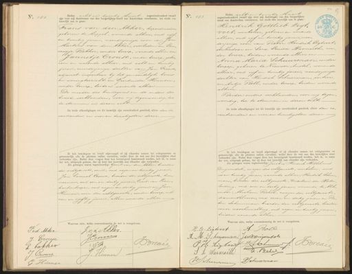 No. 182. Heden acht en twintig Maart negentienhonderd twaalf zijn voor mij Ambtenaar van den burgerlijken stand van Amsterdam verschenen, ten einde een huwelijk aan te gaan: Frans van den Akker, koperdraaier, geboren te Meppel, wonende alhier, oud vijf„ en twintig jaren, meerderjarige zoon van Jan Martens van den Akker, overleden en Lam„ migje Bakker, zonder beroep, wonende alhier en Jannetie Crouse, zonder beroep, gebo„ ren en wonende alhier, oud acht en twintig jaren, meerderjarige dochter van Jan Crouse, adjunct- inspecteur bij het gemeentelijk bouw en woningtoezicht en Geertruida Hinnen, zonder beroep, beiden wonende alhier. De moeder des bruidegoms en de ouders der bruid verklaarden, voor mij tegenwoordig, toe„ te stemmen in dezen echt.- De beide afkondigingen tot dit huwelijk zijn onverhinderd geschied, alhier den ze„ ventienden en vier en twintigsten dezer, Ik heb bruidegom en bruid afgevraagd of zij elkander nemen tot echtgenooten en getrouwelijk alle de plichten zullen vervullen, welke door de wet aan den huwelijken staat, verbonden zijn. Nadat deze vragen door hen bevestigend beantwoord werden, heb ik, in naam der wet, uitspraak gedaan, dat zij door het huwelijk aan elkander zijn verbonden. Als getuigen waren tegenwoordig: Gerrit van den Akker, broeder des echtgenoots, smid, oud negen en twintig jaren; Jan Samuel Crouse, broeder der echtgenoote, tim„ merman, oud een en dertig jaren, Evert van Veen„ kantoorlooper, oud negen en dertig jaren en Jan Kinnen, oom der echtgenoote, zonder beroep, oud een en vijftig jaren; allen wonende alhier. 10 No. 183 Heden acht en twintig Maart negentienhonderd twaalf zijn voor mij Ambtenaar van den burgerlijken stand van Amsterdam verschenen, ten einde een huwelijk aan te gaan: Hendrik Gottlieb Ligt„ volt, winkelier, geboren en wonende alhier, oud vijf en twintig jaren, meer„ derjarige zoon van Pieter Hendrik Ligtvolt, stukadoor en Sara Louisa Wasmoeth, zon„ der beroep, beiden wonende alhier en Anna Maria Schuurman, zonder beroep, geboren te Nieuwer- Amstel, wonende alhier, oud vijf en twintig jaren, meerderjarige dochter van Hendrik Schuurman, portier; en Antje Boll, zonder beroep, beiden wonende alhier. Beider ouders verklaarden, voor mij tegen„ woordig, toe te stemmen in dezen echt. De beide afkondigingen tot dit huwelijk zijn onverhinderd geschied, alhier den ze ventienden en vier en twintigsten dezer.— Ik heb bruidegom en bruid afgevraagd of zij elkander nemen tot echtgenooten en getrouwelijk alle de plichten zullen vervullen, welke door de wet aan den huwelijken staan verbonden zijn. Nadat deze vragen door hen bevestigend beantwoord werden, heb ik, in naam der wet, uitspraak gedaan, dat zij door het huwelijk aan elkander zijn verbonden. Als getuigen waren tegenwoordig: Jacobus Hendrik Wilhelmus Duijvendak, zwager des echtgenoots, winkelier, oud zes en twintig jaren, wonende alhier; Hendrik Schuur„ man, broeder der echtgenoote, Directeur der Water„ leiding, oud een en dertig jaren, wonende te Alk, maar: Abraham Peekel, zwager der echtgenoote diamantkeloover, oud zeven en dertig jaren en Pie, ter Schuurman, broeder der echtgenoote, houder eener waschinrichting, oud negen en twintig jaren, beiden wonende alhier. Waarvan akte, welke overeenkomstig de wet is voorgelezen. Waarvan akte, welke over tig de is voorgelezen. G. v. d. Akker. F vd Akker JCron J: Prouse Brevee E bakker J. Croure Je bennen G. Hinnes H. G: Ligtvoet A Boll A.M. Schuurman. Jaesknenisendat h Brevee PH. Ligtwer JSschuu S L Wasmaelk A. Bekel JScheuma Schuurman