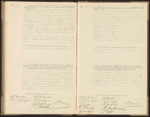 No. 186 Heden -achtentwintig Maart negentienhonderd twaalf zijn voor mij Ambtenaar van den burgerlijken stand van Amsterdam verschenen, ten einde een huwelijk aan te gaan: Wilhelmus Jacobus Arnoldi kapper geboren en wonende alhier, oud vier en der„ tig jaren, meerderjarige zoon van Michaël Andries Henri Arnoldi zonder beroep wonen de alhier en Maria Helena Dekker, overleden en Maria Louisa Agnes Baija zonder be roep, geboren te Maastricht, wonende alhier oud vyf entwintig jaren, meerderjarige dochter van Jan Wijnand Julius Baya, kleermaker wonende te Norg en Maria Louisa Bender„ overleden.- De vader der bruid heeft, blijkens hierbij overge„ legde authentieke akte in dezen echt toege stemd De beide afkondigingen tot dit huwelijk zijn onverbinderd geschied, alhier den ze ventienden en vier en twintigsten dezer Ik heb bruidegom en bruid afgevraagd of zij elkander nemen tot echtgenooten en getrouwelijk alle de plichten zullen vervullen, welke door de wet aan den huwelijken staat verbonden zijn. Nadat deze vragen door hen bevestigend beantwoord werden, heb ik, in naam der wet, uitspraak gedaan, dat zij door het huwelijk aan elkander zijn verbonden Als getuigen waren tegenwoordig: Michail Andries Henri Ar nolde vader des echtgenoots, oud achtenzeventig ja ren, wonende alhier, Hendrik Jacobus Meijer zwager des echtgenoots oud zes en vyftig jaren, wo nende te Nijmegen beiden zonder beroep, Julius Gerardus Arnoldus Hubertus Baija broeder der echtgenoote, korporaal der infanterie, oud drie en twintig jaren en Sjoerd Hoekstra, kantoorbediende oud vijftig jaren, beiden wonende alhier. Waarvan afte, welke overeeg No. 187 Heden drie April negentienhonderd twaal zijn voor mij Ambtenaar van den burgerlijken stand van Amsterdam verschenen, ten einde een huwelijk aan te gaan: Frederik Antoon Lodewijk de Vries tim merman, geboren en wonende alhier. oud drie en twintig jaren, meerderjarige zoon van Siefke Jan Gerard de Vries, timmer man en Christina Johanna de Moes, zonder beroep, beiden wonende alhier, en Grietje Duijts zonder beroep, geboren te Sloten in Noordholland, wonende alhier. oud vijf en twintig jaren meerderjarige doch ter van Jan Duijts, werkman en Gerritje, schrijver, zonder beroep, beiden wonende alhier Beider ouders verklaarden, voor mij tegen„ woordig, toe te stemmen in dezen echt.- De beide afkondigingen tot dit huwelijk zijn onverhinderd geschied, alhier den vier en twintigsten en een en dertigsten Maart laatstleden Ik heb bruidegom en bruid afgevraagd of zij elkander nemen tot echtgenooten en getrouwelijk alle de plichten zullen vervullen, welke door de wet aan den huwelijken staat verbonden zijn. Nadat deze vragen door hen bevestigend beantwoord werden, heb ik, in naam der wet, uitspraak gedaan, dat zij door het huwelijk aan elkander zijn verbonden. Als getuigen waren tegenwoordig: Gerard de Vries, oud een en veertig jaren, Willem de Vries, oud drie en dertig jaren, beiden spoorbeambte en broeder des echtge noots, Pieter Andersen, werkman, oud vier en zestig jaren, Jan Duijts broeder der echtgenoote postbeambte, oud een en twintig jaren allen wo- nende alhier. Waarvan akte, welke overeenkomstig de wat is vooro e wet is voorgelezen. W. J. Arnoldi MA HeFrnolds M.L. A. Bayja H. J. Meijer Brevee J.G. AH. Baija BHolksten de wet is voorgelezen. J. A. L.dc Vries G. Duijts S. J. G de Vrier Gr v Vuies Brevel W de Vuis J Duyst V de knoe P. Anderden J. Dirie G Aichyter