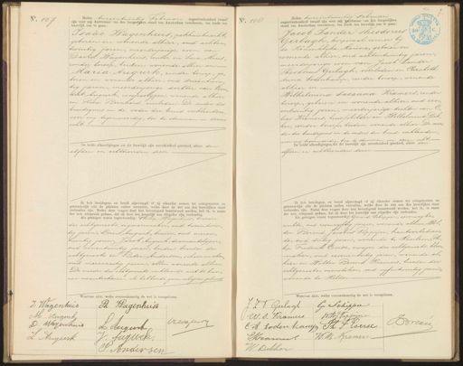 No. 107 Heden tweeëntwintig Februari negentienhonderd twaalf zijn voor mij Ambtenaar van den burgerlijken stand van Amsterdam verschenen, ten einde een huwelijk aan te gaan Isaac Wagenhuis, pakhuisknecht, geboren en wonende alhier, oud achten„ twintig jaren, meerderjarige zoon van David Wagenhuis, venter en Sara Muis„ zonder beroep, beiden wonende alhier en- Maria Augurk, zonder beroep, ge„ boren en wonende alhier, oud drieëntwin„ tig jaren, meerderjarige dochter van Leen, dert Augurk, roosjesslijper, wonende alhier en Rosa Bernhard, overleden. De ouders des bruidegoms en de vader der bruid verklaarden. voor mij tegenwoordig, toe te stemmen in dezen echt. De beide afkondigingen tot dit huwelijk zijn onverhinderd geschied, alhier den elfden en achttienden dezer Ik heb bruidegom en bruid afgevraagd of zij elkander nemen tot echtgenooten en getrouwelijk alle de plichten zullen vervullen, welke door de wet aan den huwelijken staat verbonden zijn. Nadat deze vragen door hen bevestigend beantwoord werden, heb ik, in naam der wet, uitspraak gedaan, dat zij door het huwelijk aan elkander zijn verbonden. Als getuigen waren tegenwoordig: Thilip Wagenhuis, broeder des echtgenoots, sigarenmaker, oud tweeëntwin tig jaren, Louis Augurk, kruier, oud vieren„ twintig jaren, Jacob Augurk, diamantslijper, oud eenentwintig jaren, beiden broeder der echtgenoote en Pieter Andersen, schoenmaker oud vierenzestig jaren, allen wonende alhier De moeder des echtgenoots verklaarde niet te kun„ van naanterkeren, al hebbende geen vlijven geberd Neaeae vals oerenteuiig de velie veren No. 108 7 Heden tweeëntwintig Februari negentienhonderd twaalf zijn voor mij Ambtenaar van den burgerlijken stand van Amsterdam verschenen, ten éinde een huwelijk aan te gaan: Jacob Zander Theodorus 311 Gerlagh, korporaal sener bij a de Köninklijke Marine, geboren en wonende alhier, oud achtentwintig jaren meerderjarige zoon van Jacob Lander Theodorus Gerlagh, overleden en Elirabeth Anna Sodenkamp, zonder beroep, wonende alhier en Wilhelmina Susanna Kramers, zonder beroep, geboren en wonende alhier, oud een entwintig jaren, meerderjarige dochter van E„ lias Kramers, huisschilder en Wilhelmina Dek„ ker, zonder beroep, beiden wonende alhier. De moe„ der des bruidegoms en de ouders der bruid verklaarden; voor mij tegenwoordig, toe te stemmen in dezen echt„ De beide afkondigingen tot dit huwelijk zijn onverhinderd geschied, alhier den elfden en achttienden dezer Ik heb bruidegom en bruid afgevraagd of zij elkander nemen tot echtgenooten en getrouwelijk alle de plichten zullen vervullen, welke door de wet aan den huwelijken staat verbonden zijn. Nadat deze vragen door hen bevestigend beantwoord werden, heb ik, in naam der wet, uitspraak gedaan, dat zij door het huwelijk aan elkander zijn verbonden Als getuigen waren tegenwoordig: Gerard Schipper, spoorwegbe„ ambte, oud zesenvijftig jaren, wonende alhier, Wol„ ter Berend Jacobus Pippijn, kantoorbedien de, oud dertig jaren, wonende te Haarlem, Phi lip Frederik Coerse, zwager des echtgenoots, kleer„ maker, oud zevenendertig jaren, wonende al„ hier en Wolter Berend Kramers, broeder der echtgenoote, ouurstoker, oud vijfentwintig jaren; wonende te Helder. J: Wagenhuis T Hagenhuis M. Augink Onwoperden D. Wayenhuis L Augurt L. Augurk J. Jugwek. P. Andersen J J d Gerlagt G Schippeer W. S. Kramers Weldv/ Teppyn E A Sodenkamp Ph. F Eoerse Brevee W.M. Kramers. EKkramert W. Dekken