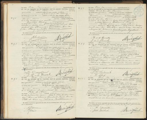 Gooitse Ploeg van beroep kriner., wonende Vijzelstraat 30. oud negen en dertig jaren., geboren te Harlingen Echt„ genoot van Zieuwkje Holstein, zoon van Jan Ploeg en Jeltje Wiersma En hebben wij hiervan opgemaakt deze akte, die na voorlezing door de aangevers en ons is onderteekend. Pois Mn. Aren van bichuig No. 97 Op heden Vier Januari negentienhonderd een, zijn voor ons Ambtenaar van den burgerlijken stand der gemeente Amsterdam verschenen: Dirk van den Broeke. 2 van beroep aanspreker oud twee en dertig jaren, wonende al- hier, en Jacobus van den Broeke. van beroep aanspreker oud twee en zeventig jaren, wonende alhier., die ons hebben verklaard dat op den derden dezer, des voor middags, ten acht ure in het huis Egelantiers gracht 66. , is overleden Johanna Catharina Meijer van beroep - geen, wonende alhier. oud vier en zeventig Jaren, geboren alhier Echtge „noote van Jan Ehnnen, doch ter van Hendrik Meijer en Johanna Geertruijda Engelbert En hebben wij hiervan opgemaakt deze akte, die na voorlezing door de aangevers en ons is onderteekend. D. v.d. Broeko Hondrikshul J. v. d. Broeke No. 93 Op heden Vier Januari negentienhonderd een zijn voor ons Ambtenaar van den burgerlijken stand der gemeente Amsterdam, verschenen: Derk Gerritsen. van beroep aanspreker- oud vijfendertig jaren, wonende alhier. — en Johannes christoffel van der Bunt van beroep aanspreker oud twee en zestig jaren, wonende alhier ,die ons hebben verklaard, dat op den derden dezer, des voor middags ten Vijf ure in het huis tweede Bloemdwarsstraat 9-, is overleden Cornelis Hendrik Steuven. van beroep steenhouwer, wonende alhier oud vier en dertig jaren, geboren alhier, weduwnaar van Lena / Wilhelmina Lind, zoon van Hendrik Johannes Steuren, en Cornelia Hemeltop. En, hebben wij hiervan opgemaakt deze akte, die na voorlezing door de aangevers en ons tis onderteekend. Hondng OGerritsen 27 H vD Bunl No. 99 Op heden Vier Januari negentienhonderd een, zijn voor ons Ambtenaay van den burgerlijken stand der gemeente Amsterdam, verschenen: Petrus Wilhelmus Wissenract, van beroep aanspreker oud zevenendertig jaren, wonende alhier. en Pieter Fjerp. van beroep aanspreker. oud eenen veertig jaren, wonende alhier- „die ons hebben verklaard, dat op den tweeden dezer., des voor middags ten twee ure in het huis Pieter Vlamingstraat 60. is overleden Johannes Adrianus de Vreede. van beroep - geen:, wonende alhier oud zestien dagen, geboren alhier, zoon van Johanna Maria de Vreede zonder beroep wonende alhier. En hebben wij hiervan opgemaakt deze akte, die na voorlezing door de aangevers en ons is onderteekend. BAa J: V issenaet Hondrikschul A. Sjerp No. 95. Op heden Vier Januari negentienhonderd een, zijn voor ons Ambtenaar van den burgerlijken stand der gemeente Amsterdam, verschenen: Karel Jansen, van beroep aanspreker oud twee en Veertig Jaren, wonende alhier. en Jacob Fermie. van beroep aanspreker. oud vijfendertig jaren, wonende alhier- , die ons hebben verklaard, dat op den — tweeden dezer, des voor middags ten tien ure in het huis Anjelierstraat 191., is overleden Peter de Vree van beroep geen., wonende alhier oud vyfenzeventig jaren, geboren te Tiel weduw naar van Johanna Maria Elisabeth Pieper zoon van Pieter de Vree en Juliana Zoetellouw.- En hebben wij hiervan opgemaakt deze akte, die na voorlezing door de aangevers en ons is onderteekend. Ponij KJamen Temme No. 101 Op heden Vier Januari, negentienhonderd een, zijn voor ons Ambtenaar (van den burgerlijken stand der gemeente Amsterdam, verschenen: Hendrik Greevelt. van beroep aanspreker oud zesen Veertig Jaren, wonende alhier. en Johannes Antonius Detsch- van beroep aanspreker. oud vijfen dertig - Jaren, wonende alhier. die ons hebben verklaard, dat op den eersten dezer., des na middags ten zes- ure in het huis Conradstraat 38., is overleden geboren een kind van het mannelijk geslacht uit Teuintje van beroep Hartman echt, wonende genoote van Aart ster oe stege, van beroep bak eerererker, wonende alhier. Welk kind als leven loos wordt aangegeven En hebben wij hiervan opgemaakt deze akte, die na voorlezing door de aangevers en ons is onderteekend, goedkeurende de doorhaling van zes gedrukte woorden in deze akte, CGewelk Hondrikchut Jet Dutock