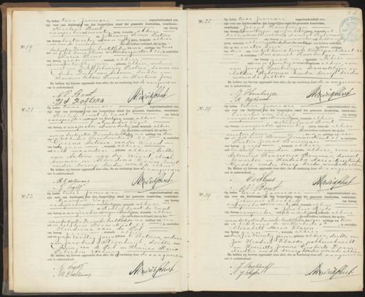 No. 19 Op heden twee Januari negentienhonderd een, zijn voor ons Ambtenaar van den burgerlijken stand der gemeente Amsterdam, verschenen: Nicolaas Bont van beroep aanspreker oud zeventig, jaren, wonende alhier en Johannes Simon Portma van beroep bootwerker oud vier en vijftig jaren, wonende alhier zoon van de overledene, die ons hebben verklaard, dat op den — dertigsten December laatstleden, des na middags ten twee ure in het huis Kleine Wittenburgerstraat 25, is overleden Maria Prins van beroep geen, wonende alhier oud zeven en tachtig jaren, geboren alhier, weduwe eerst van Dirk Johannes Postma, daarna van Auke Dirks van Ackeren, dochter van Harmen Eikens Prins en Martina Jans En hebben wij hiervan opgemaakt deze akte, die na voorlezing door de aangevers en ons is onderteekend. N. Bonrt Reneritsele S Postma No. 25 Op heden twee Januari negentienhonderd een, zijn voor ons Ambtenaar van den burgerlijken stand der gemeente Amsterdam, 3 verschenen: Joseph Hamburger van beroep deamantslijper oud vijf en dertig jaren, wonende al 1517½ hier, vader van den overledene, en Manuel Rijksman, van beroep ugurenmaker oud acht en vyftig s1nt jaren, wonende alhier grootvader van den overledendie ons hebben verklaard dat op den eersten dezer, des voor middags ten drie ure in het huis tweede Oosterparkstraat 4 , is overleden Emanuel Hamburger van beroep geen, wonende alhier oud een en twintig maandergeboren alhier, zoon van Joseph Hamburder diamantslijper, en Estder Rijksman zonder beroep beiden wonende alhier En hebben wij hiervan opgemaakt deze akte, die na voorlezing door de aangevers en ons is onderteekend. endngchu J. Hamburger S Ryksman No. 21 Op heden twee Januari negentienhonderd een zijn voor ons Ambtenaar van den burgerlijken stand der gemeente Amsterdam, verschenen: Roelof linst de zwart van beroep aanspre ter oudnegen en twintig aren, wonende alhier en Gerardus Vogel van beroep danseker oud vieren dertig jaren, wonende alhier , die ons hebben verklaard, dat op den een en dertigsten December laatsttiges, na middags ten drie ure in het hiis Huidenstraat 25, is overleden Gezina Antonia van der Weerd van beroep geen, wonende alhier oud acht maanden, geboren alhier, dochter van Antoon van der Weerd, vleesch houwer en Alberdina Gezina, zwart zonder beroep beiden wonende alhier. En hebben wij hiervan opgemaakt deze akte, die na voorlezing door de aangeversen ons is onderteekend. R.E. de Zwars Rodrikcrus J Vogelfr No. 27 Op heden twee Januari negentienhonderd een, zijn voor ons Ambtenaar van den burgerlijken stand der gemeente Amsterdam, verschenen Cornelis van Hees van beroep aanspreker oud acht en veertig jaren, wonende alhier en Nicolaas Bont van beroep aanspreker oud zeventig jaren, wonende alhier eersten dezer de on hebben verklaard, deatop den des namiddags ten een 6 ure in het huis Binnen Dommerstraat 13 is overleden Pieter Jonas Bouman van beroep geen, wonende alhier oud twaalf maanden, geboren alhier zoon van Antonius Fanciseus Bouman, diamant bewerker en Hendrika Maria Geertruida Gose zonder beroep beiden wonende alhier En hebben wij hiervan opgemaakt deze akte, die na voorlezing door de aangeversi ons is onderteekend. E d Hbees Hondrdkhul V Jant No 23 negentienhonderd een Op heden twee Januari zijn voor ons Ambtenaar van den burgerlijken stand der gemeente Amsterdam, verschenen: Gerardus Vogel van beroep aan aprekeroud vier en dertig jaren, wonende alhier en Roel of Ernst de Zwart van beroep aan opzeker oud negen entwintig jaren, wonende alhier ,die ons hebben verklaard, dat op den een en dertigsten December laatstledendes na middags ten een ure in het huis Boomstraat 52, is overleden Hendrina van de Io van beroep een, wonende alhier oud negenen tachtig jaren geboren te Heteren, weduwe van Jacobus Ssteenhuijl dochter van Arien, van de Fol en Henrica Maria Peterken Verburg En hebben wij hiervan opgemaakt deze akte, die ve voorlezing door de aangeversen ons is onderteekend. G Sagel Aondrkschul „RE. deZwarf No. 29 28 Bo Op heden twee Januari negentienhonderd een zijn voor ons Ambtenaar van den burgerlijken stand der gemeente Amsterdam, verschenen Johannes Boekhof van beroep aanspreker oud zes en veertig jaren, wonende alhier en Jacobus Rijke van beroep aanspreker oud acht en dertig Jaren, wonende alhier ,die ons hebben verklaard, dat op den een en dertigsten December laatstleden des voor middags ten tien ure in het huis de wittenkade ,d Elisabeth Maria Klazen. is gereden van beroep geen, wonende alhier oud drie en twintig jaren, geboren alhier, dochter van Jan Hendrik Klasen, pakhuisknecht en Henriette Jeanne Cisberte Darm stoedter zonder beroep beiden wonende alhier En hebben wij hiervan opgemaakt deze akte, die na voorlezing door de aangevers in ons is onderteekend. J. Boekhoff J. Ryke Bondnakhul