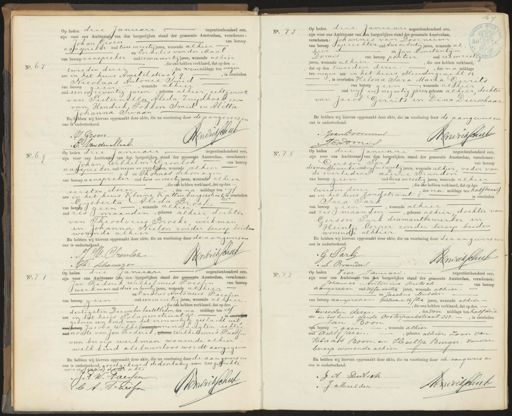 No. 67 Op heden drie Januari negentienhonderd een, zijn voor ons Ambtenaar van den burgerlijken stand der gemeente Amsterdam, verschenen: Johan Groen van beroep aanspreker oud twee en zestig jaren, wonende alhier en Cornelis van der Maal van beroep aanspreker oud zeven en veertig jaren, wonende alhier „die ons hebben verklaard, dat op den - tweeden dezer, des voormiddags ten negen ure in het huis Amstelstraat 9, is overleden Nicolaas Antonie Smid van beroep alen, wonende alhier oud een en zeventig jaren, geboren alhier, echtgenoot van Pieternilla Alida Zuijdhoek zoon van Hendrik, Fokken Smid en Aletta Johanna Swaan En hebben wij hiervan opgemaakt deze akte, die na voorlezing door de aangevers en ons is onderteekend. Hendrial J. Groen Van der Maal. No. 73 Opheden drie Januari negentienhonderd een, zijn voor ons Ambtenaar van den burgerlijken stand der gemeente Amsterdam, verschenen: Johannes van Doornum van beroep oprichter oud drie en dertig jaren, wonende al hier en Jan Constantijn Domis van beroep partier oud zes en rest jaren, wonende alhier, die ons hebben verklaard dat op den tweeden dezer, des na middags ten negen ure in het huis Mendergracht 14 , is overleden Helena Sara Maria Gerrits van beroep geen, wonende alhier oud vijf en negentig jaren geboren alhier, dochter van Jacob Gerrits en Dina Dierschaar En hebben wij hiervan opgemaakt deze akte, die na voorlezing door de aangevers en ons is onderteekend. Hanrikeul JvanHoormmt J Ponis No. 69 — negentienhonderd een, Op heden drie Januari zijn voor ons Ambtenaaf van den burgerlijken stand der gemeente Amsterdam, verschenen: Johan, Wilhelm Gronlok van beroep aanspreker oud negen en viertijaren, wonende alhier en Thomas Schonagin van beroep aanspreker oud twee en veertig jaren, wonende alhier , die ous hebben verklaard, dat op den — eersten dezer, des na middags ten vif ure in het huis Kleine Kattenburgerstraat is overleden Gysberta Alida Broeke van beroep geen, wonende alhier oud zes maanden, geboren alhier dochter van Theodorus Broeke werkman en Johanna Nielen zonder beroep beiden wonende alhier. En hebben wij hiervan opgemaakt deze akte, die na voorlezing door de aangevers en ons is onderteekend. Bondrikerar JJ V. Gronloh Gh: Schonager No. 75 Op heden drie Januari negentienhonderd een, zijn voor ons Ambtenaar) van den burgerlijken stand der gemeente Amsterdam, verschenen: Cirson Sark van beroep diamandbe werker oud vyf en twintig jaren, wonende alhier, vader van de overledene en Level Brandon van beroep geen oud twee en zestig jaren, wonende alhier tweeden dezer die bts hebben verklaard, dat op der „des na middags ten halftwaalf ure in het huis zandstraat 5 is overleden Sara Sark van beroep geen, wonende alhier oud zes maanden, geboren alhier, dochter van Gerson Turk diumantbewerker en Heintje Corper zonder beroep beiden wonende alhier En hebben wij hiervan opgemaakt deze akte, die na voorlezing door de aangevers en ons is onderteekend. G Fart Bandrikschul L Branden No. 71 negentienhonderd een, Op heden drie Januari zijn voor ons Ambtenaar Can den burgerlijken stand der gemeente Amsterdam, verschenen: Jan Frederik Wilhelmus Paeslen van beroep werkman oud drie en twintig jaren, wonende alhier en Carolus Antonius Faessen van beroep geen oud een en zestig jaren, wonende alhier , die ons hebben verklaard, dat op den - dertigsten December laatstleden, des na middags ten elf„ ure in het huis Polanenstraat 18, is overh geboren een kind van het vrouwelijke geslacht uit„ van beroep Jacoba Wilhelvonendomina Luiten echtge oud noote van Jan Frederik, geboren Wilhelmus Faessen van beroep werkman wonende alhier welk kind als levenloos wordt aangegeven En hebben wij hiervan opgemaakt deze akte, die na voorlezing door de aangevers en ons is onderteekend, goedgekeurd de doorhaling van zes gebrukte woord ean deze akte J:J W. Poessen Bondigehe b A Teressen No. 77 Op heden Vier Januari negentienhonderd een zijn voor ons Ambtenaar van den burgerlijken stand der gemeente Amsterdam, verschenen: Johannes Antonius Dutsch. van beroep aanspreker oud vijfendertig jaren, wonende alhier. op Jacobus Mulder- van beroep aanspreker oud zeven en vyftig jaren, wonende alhier ,die ons hebben verklaard, dat op den tweeden dezer, des voor middags ten half drie ure in het huis derde Oosterparkstraat 212., is overleden Jan Boon van beroep geen, wonende alhier oud acht Jaren, geboren alhier zoon van: Klaas Boon, en Heiltje Burger, zonder beroep wonende alhier En hebben wij hiervan opgemaakt deze akte, die na voorlezing door de aangevers en ons is onderteekend. J. A. Dutsch Honvriksut J Mulder