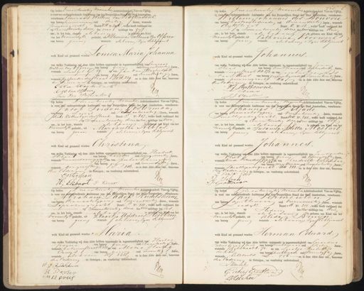 Op heden Drieentwintig November Achtttienhonderd Vier-en-Vijfttig, is voor ons ondergeteekende Ambtenaar van den Burgerlijken Stand der Stad Amsterdam, verschenen: Coenraad Willem van Hagiendonk van beroep timmerman oud dertig Jaren, wonende prinsengracht. Buur HH. No 296, welke heeft verklaard dat op Een en twintig dezer des voor middags ten vi ure, in het huis, staande als boven is geboren een kind van het vrouwelijke geslacht, uit Willemina Anthonia van Offeren, van beroep geen wonende als boven: zine Echtgenoot welk Kind zal genaamd worden Louisa Maria Johanna van welke Verklaring wij deze Akte hebben opgemaakt in tegenwoordigheid van oenraad Willem van Opferen van beroep geen oud zevenenzeventig Jaren, wonende zingel G 59. en van Jan van Wagtendank van beroep geen oud Eenenzestig Jaren, wonende palseerderdirstraat NH. 229 en is deze Akte foor ons, benevens den Vader en de Getuigen, na voorlezing onderteekend C W van Wagberdank C: V: van Offeren 419 rn Wagtendonk Op heden Drieentwintig novembig Achttienhonderd Vier-en-Vijftig is voor opondergeteekende Ambtendar van den Burgerijken Stand der Stad Zsterdam, verschenen Willem Johannes des Souvrie van beroep kantoorbediende oud drieendertig Jaren, wonende dykstraat Buurt O. No. 58., welke heeft verklaard dat op Twee entwintig dezer des voordiddags ten drie ure, in het huis, staande als boven geboren een Kind van het mannelyke geslacht, uit Catharina Voorwerk van beroep geen wonende als boven: zyn Echtgenoot welk Kind zal genaand worden Johannes van welke Verklaring wij deze Akte hebben opgemaakt in tegenwoordigheid van Jean Elias van beroep ambtenaar oud achtendertig Jaren, wonende Looyerstraat aa 371. en van Jacobus Josephus van Mens van beroep geamplogeerde oud zevenentwintig Jaren, wonende prinsengracht das en is deze Akte door ons sepeven den vaderen, de Getuigen, na voorlezing onderteekend. de Bouwne lras Hg J van Mer Op heden Drieentwintig november Achtienhonderd Vieren-Vijtig, is voor ois ondergeteekende Ambtenaar van den Burgerlijken Saad der Stad Amsterdam, verschenen: Jacob Simon & Osierman van beroep Smid oud zesentwintig Jaren, wonende derde kattenbierdustraat Buurt I No. 807, welke heeft verklaard dat op Tweeentwintig dezer des na middags ten vier ure, in het huis, staande als boven is geboren een kind van het vrouwelyke geslacht, uit Margaretha Alblas. van beroep gien wonende als boven: zyne Echtgenoot welk Kind zal genaamd worden Christina van welke Verklaring wij deze Akte hebben opgemaakt in tegenwoordigheid van Hendrik van beroep boonder oud tweeenveertig Jaren, Ekhar wonende rien wendammergrachtien van pieter Krengers van beroep gian, oud tweeenvijftig Jaren wonende googerssteeg . 316. en is deze Akte Koortons, benevens den Vadern de Getuigen, na voorlezing onderteekend. Oosterman 2/9 H: Ekkaat P Kreuw Op heden Drieentwintig nogemben Achtienhonderd Vier-en-Vijftig, is voor ons Ondergeteekende Ambtenaar van den Burgerijten Stand der Stad Amsterdam, verschenen: Johannes Lijade van benen diamantslijper oud vierentwintig Jaren, wonende Sen alle padsgracht, Buurt 414. No. 846, wekke heeft verklaard dat op Eenen twintig dezer de voormiddags ten Elf. ure, in het huis, staande als boven is geboren een zind van het mannelyk geslacht, uit Susanna Pietta Mgelari van beroep geen wonende als boven: zyne Echtgenoot welk Kind zal genaamd worden Johannes van welke Verklaring wij deze Akte hebben opgemaakt in tegenwoordigheid van Jan van der van beroep geen oud tweeenviftig Jaren, vrietRestraaten van Frederik Gertitaar wonende tweede Rozendere 166 van beroep wiykman oud zevenenzestig Jaren, wonende Smmallepade gracht. UUt 882 en is deze Akte door ons benevens den vader n de Getuigen, na voorlezing onderteekend. J Van n veret Sslrate Reeg J: Gertraar Op heden Drieentwintig November Achtienhonderd Vieren-Vijtig is voor ons ondergeteekende Ambtenaar van den Burgerlijken Stand der Had Amsterdam, verschenen: Abraham Ladok Rudelsheim van beroep diamantslijperg oud tweeenveertig Jaren, wonende Scprozengracht Buurt P. No. 111, welke heeft verklaard dat op Tweeentwintig dezer des voormiddags ten Zes ure, in het huis, staande alsboven is geboren een kind van het vrouwelyk geslacht, uit Klaartje Andries Reibron van beroep geen wonende als boven zine Echtgenoot vonden Maria welk Kind zal gen van welke Verklaring wij deze Akte hebben opgemaakt in tegenwoordigheid van Kartog parzer van beroep gen oud anenzestig Jaren, wonende botaouerstraat K 23 en van Mozes Harto Cruys van beroep geen oud zeventig Jaren, wonende, als boven 1 125 en is deze Akte door ons, benevens den vaderen de Getuigen, na voorlezing onderteekend. A J Redelshem 119 H Barser MMHCruf Op heden Drieentwinti november Achtienhonderd Vieren-Vitig, is voor ons ondergeteekende Ambtenaar van den Burgerlijken Stand der Stad Amsterdam, verschenen: Jan Vermeuten van beroen ambtenaar oud vierenveertig Jaren, wonende eedik Buurt M. No. 215, welke heeft verklaard dat op Heden des voor middags ten drie ure, in het huis, staande als ladin is geboren een Kind van het tannelyke geslacht, uit Alida Bruijn. van beroep geen wonende als boven: zyne Echtgenoot welk Kind zal genaamd vorden Herman Eduard. van welke Verklaring wij deze Akte hebben opgemaakt in tegenwoordigheid van Gerardus Pieters Graafland van beroep embtenaar oud zestig Jaren, wonende dykstraat O. 70. en van Lintje Kielikes de Koe van beroep ambtenaar oud vierenvijftig Jaren, wonende hekelveld L. 756 en is deze Akte door ons, benevens den Vaderen de Getuigen, na voorlezing onderteekend. Bemmculer g GPieters Craattanc LH de Koe