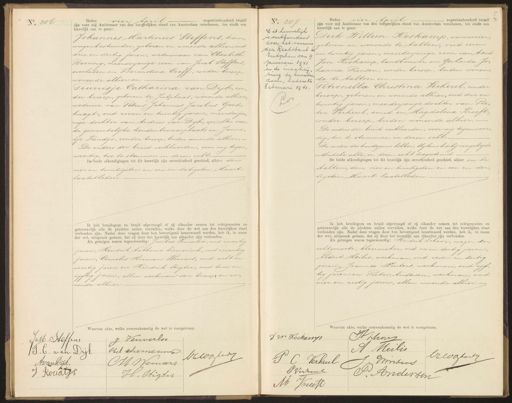 No. 206 Heden vier srril negentienhonderd twaalf zijn voor mij Ambtenaar van den burgerlijken stand van Amsterdam verschenen, ten einde een huwelijk aan te gaan: Johannes Martinus Steffens, tram wagenbestuurder, geboren en wonende alhier, oud drie en dertig jaren, weduwnaar van Elisabeth Boering, meerderjarige zoon van Jacob Steffens, overleden en Barendina Loeff, zonder beroep, wonende alhier en Teunisje Catharina van Dijk, zon„ der beroep, geboren te Jutphaas, wonende alhier; weduwe van Petrus Johannes Jacobus Goed„ knegt, oud zeven en twintig jaren, meerderja„ rige dochter van Andries van Dijk, opzichter van de gemeentelijke hondenbewaarplaats en Janne„ tje Koudijs, zonder beroep, beiden wonende alhier.- De ouders der bruid verklaarden, voor mij tegen„ woordig, toe te stemmen in dezen echt„ De beide afkondigingen tot dit huwelijk zijn onverhinderd geschied, alhier den vier en twintigsten en een en dertigsten Maart laatstleden Ik heb bruidegom en bruid afgevraagd of zij elkander nemen tot echtgenooten en getrouwelijk alle de plichten zullen vervullen, welke door de wet aan den huwelijken staat verbonden zijn. Nadat deze vragen door hen bevestigend beantwoord werden, heb ik, in naam der wet, uitspraak gedaan, dat zij door het huwelijk aan elkander zijn verbonden. Als getuigen waren tegenwoordig: Jacobus Venverloo, oud zeventig jaren, Hendrik Anthonie Siemerink, oud zeventig jaren, Cornelis Herman Wernars, oud acht en veertig jaren en Hendrik stigter, oud twee en vijftig jaren, allen werkman van beroep en wo„ 8 nende alhier. No. 207 Dit huwelijk is ontbouden) door het vonnis der Rechtbank te Zutphen van 9 Januari 1941 en de inschrij¬ ving. te turster. dam, heden 12 Februari 1941. Pv: Heden vier April negentienhonderd twaalf zijn voor mij Ambtenaar van den burgerlijken stand van Amsterdam verschenen, ten einde een huwelijk aan te gaan: Derk Willem Koskamp, warmoezier geboren en wonende te Aalten, oud zeven en twintig jaren, meerderjarige zoon van Arend Jan Koskamp, landbouwer en Gerharda Jo„ „hanna Prinsen, zonder beroep, beiden wonen„ de te Aalten en Petronella Christina Verheul, zonder beroep, geboren en wonende alhier, oud drie en twintig jaren, meerderjarige dochter van Pie„ ter Verheul, smid en Magdalena Kreeft, zonder beroep, beiden wonende alhier. De ouders der bruid verklaarden, voor mij tegenwoor„ dig, toe te stemmen in dezen echt. De ouders des bruidegoms hebben, blijkens hierbij overgelegde authentieke akte, in dezen echt toegestemd. De beide afkondigingen tot dit huwelijk zijn onverhinderd geschied, alhier en te Aalten, den vier en twintigsten en een en der„ tigsten Maart laatstleden: Ik heb bruidegom en bruid afgevraagd of zij elkander nemen tot echtgenooten en getrouwelijk alle de plichten zullen vervullen, welke door de wet aan den huwelijken staat verbonden zijn. Nadat deze vragen door hen bevestigend beantwoord werden, heb ik, in naam der wet, uitspraak gedaan, dat zij door het huwelijk aan elkander zijn verbonden. Als getuigen waren tegenwoordig: Hendrik Schoor, zwager der echtgenoote, kleermaker, oud zes en dertig jaren. Aldert Meilis, werkman, oud zeven en dertig jaren, Joannes Winters, werkman, oud vijf„ tig jaren en Pieter Andersen, werkman, oud vier en zestig jaren, allen wonende alhier.— Waarvan akte, welke overeenkomstig de wet is voorgelezen. J. Venverloo J M. Steffens het Siemenma J.C. van Dijl CH. Wernans Valoorerg A van Dijk J Koudtjs H. Stigter DW Koshamp H Zumns A. Meilis lalogterdy P C. Verkeul Mters P Verkeul P Andersen M Vreest
