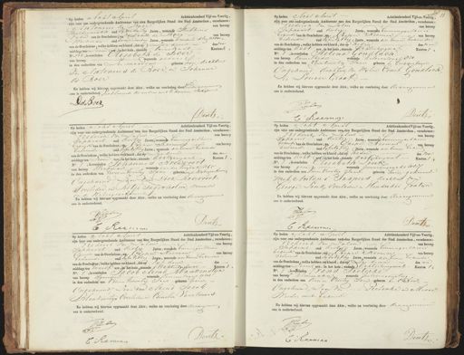 Deatz C: Rum Op heden Acht Aprit Achttienhonderd Vijfen-Veertig, zijn toor ons ondergeteekende Ambtenaar van den Burgerlijken Stand der Stad Amsterdam, verschenen: Predent van Zalm van beroep Saphoort oud dertig Jaren, wonende binnen gaethein bekende van de Overledene, enyepie Heeman van beroep bediende oud vifn vyftig Jaren, wonende als buien behuwen. van de Overledene, welke hebben verklaard, dat op rik diue des middags ten twaalf ure, in het huis, staande Achtenburwal Kanton 1, No. 1, is overleden Jacob Arend Blankenslyn van beroep jouwer, wonende Hloorenstraat n 101. in den ouderdem van Vieren twintig Jand geboren hui„ Ongehuwd zoon van Arend Jacob Blankenstijn Overleden en Cornelia Vaartsmans. En hebben wij hiervan opgemaakt deze Akte, welke na voorlezing door de aangenemen ons is onderteekend. P Zalum C7 Deutz E Reeuvar Op heden Acht Aprit Achtienhonderd Vifen-Veertg, zijn (voor ons ondergeteekende Ambtenaar van den Burgerlijken Stand der Stad Amsterdam, verschenen: Frederik van Zalm van beroep Dakhart oud dertig Jaren wonende binnen gasthuis bekende van de Overledene, en Corpie Reemau van beroep bediende oud vifen vyftig Jaren, wonende als boven bekende van de Overledene, welke hebben verklaard, datop zes dunr des na middags ten zenul ure, in het huis, staande Achtenburgwal Kanton 1; No. 1, is overleden vans Tielerke van beroep krieimake wonende palvemaanstig in den ouderdom van drieen veertig Jaar geboren te Onband Ongehuwd, Iaon Van . . . Pieterke en Maria Wesler mets bekund En hebben wij hiervan opgemaakt deze Akte, welke na voorlezing door de aangeviemen ons is onderteekend. J zuling oC Deutz GReiman