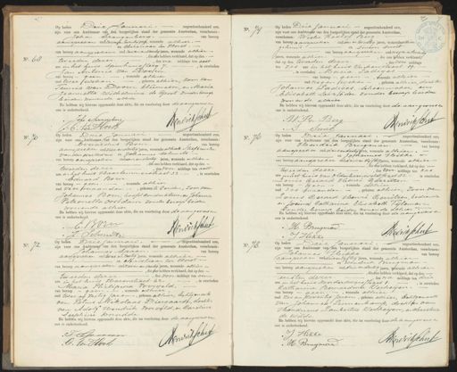 No. 68 Op heden Drie Januari negentienhonderd een, zijn voor ons Ambtenaar van den burgerlijken stand der gemeente Amsterdam, verschenen: Johan Spangenberg. van beroep aanspreker oud zevenen twintig jaren, wonende alhier.- en christiaan ter Horst.— van beroep aanspreker oud zeven en Veertig jaren, wonende alhier ,die ons hebben verklaard, dat op den tweeden dezer, des na middags ten acht ure in het huis spenhuissteeg 7., is overleden Jan Antonie van Dootrn. van beroep — geen., wonende alhier oud twee weken., geboren alhier, zoon van Teunis van Doorn kleermaker, en Maria Jeannetta Wilhelmina de Groot zonder beroep beiden wonende alhier En hebben wij hiervan opgemaakt deze akte, die na voorlezing door de aangevers en ons is onderteekend. Hendiee Johs Spangerberg JC. ter Horst No. 74 Op heden Drie Januari negentienhonderd een, zijn voor ons Ambtenaar van den burgerlijken stand der gemeente Amsterdam, verschenen: Wide Roel of Beeg gehuwd. en sinton smit o 41 van beroep aanspreker oud een en twintig jaren, wonende alhier van beroep aanspieker oud negen entwintig jaren, wonende alhier., die ons hebben verklaard, dat op den tweeden dezer, des voor middags ten zes ure in het huis Vinkenstraat 19. , is overleden Maria Ladiges van beroep geen, wonende alhier oud negen weken, geboren alhier, dochter Johannes Ladiges, schoenmaker, en Elisabeth schriöder zonder beroep beiden won en de alhier En hebben wij hiervan opgemaakt deze akte, die na voorlezing door de aangevers en ons is onderteekend. Bondesdr WR. Berg S Smit No. 70 Op heden Drie Januari. negentienhonderd een, zijn voor ons Ambtenaar Vvan den burgerlijken stand der gemeente Amsterdam, verschenen: Everardus Born van beroep aanspreker oud vierendertig jaren, wonende alhier stiefbroeder van den overledene en Johannes Schmitz van beroep aanspreker oud een en dertig jaren, wonende alhier- , die ons hebben verklaard, dat op den — tweeden dezer., des voor uiddags ten acht ure in het huis Haarlemmerstraat 32., is overleden Eduard Born. van beroep — geen:, wonende alhier oud vier naanden., geboren te Leiden, zoon van Johannes Born, hoofd conducteur, en Johanna Petronella Oostdam zonder beroep beiden wonende alhier En hebben wij hiervan opgemaakt deze akte, die na voorlezing door de aangevers en ons is onderteekend. E. BOZn Aondeikse J. Schmitz No. 76 Op heden Drie Januari, negentienhonderd een, zijn voor ons Ambtenaar van den burgerlijken stand der gemeente Amsterdam, verschenen: Hendrik Brugman. van beroep aanspreker oud drie en dertig Jaren, wonende alhier. en Johannes Hikke van beroep aanspreker oud drie en vijftig jaren, wonende alhier —, die ons hebben verklaard, dat op den — tweeden dezer., des voor middags ten zes ure in het huis van Oldenbarnev eldtstraat 83.- is overleden, Louis Gerard Henri Gerritzen. van beroep geen, wonende alhier oud zes maanden., geboren alhier, zoon van Louis Gerard Henri Gerritzen, bediende en Josina Catharina Elisabeth Tijleman, zonder beroep beiden wonende alhier En hebben wij hiervan opgemaakt deze akte, die na voorlezing door de aangeverd en ons is onderteekend. H. Brugman Hondrisschu C Hikke No. 72 Op heden Drie Januari Negentienhonderd een, zijn voor ons Ambtenaar van den burgerlijken stand der gemeente Amsterdam, verschenen: Johannes Spaan. van beroep aanspreker oud twee en zestig jaren, wonende alhier en christiaan ter Horst— van beroep aanspreker oud zeven en Veertig jaren, wonende alhier- , die ons hebben verklaard, dat op den - tweeden dezer, des voor middags ten een ure in het huis Hazenstraat 62., is overleden Maria Philipina Voorveld. van beroep - geen., wonende alhier oud twee en zestig jaren, geboren alhier, Echtgenoote van Petrus Nikolaas Diergaarde, dochter van Adolf Hendrik Voorveld, en Caroline Serphine Knudde En hebben wij hiervan opgemaakt deze akte, die na voorlezing door de aangeveis en ons is onderteekend. Omije I. Speeren C. ter Hork No. 78 Op heden Drie Januari negentienhonderd een, zijn voor ons Ambtenaar van den burgerlijken stand der gemeente Amsterdam, verschenen: Johannes Hikke van beroep (aanspeeker oud drie en vyftig jaren, wonende alhier en Hendrik Brugman.— van beroep aanspieker oud drie en dertig jaren, wonende alhier — , die ns hebben verklaard, dat op den — eersten dezer, des na middags ten drie ure in het huis Noorderdwarsstraat 1., is overleden Catharina Bernardina Verheijen. van beroep — geen, wonende alhier oud zes en zeventig jaren, geboren alhier, Echtgenoote van Johannes Linnenkamp, dochter van Hendricus Lambertus Verheijen, en christina de Wilde En hebben wij hiervan opgemaakt deze akte, die na voorlezing door de aangevers en ons is onderteekend. J Slikke Hendrikschuf „H. Brugman