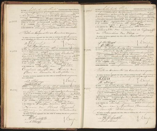 No 4852 Op heden Achtentwintig Juli Achtienhonderd Negenen zeventig, zijn voor ons ondergeteekende Ambtenaar van den Burgerlijken Stand der Gemeente Amsterdam, verschenen: Aulonius Kemp. van beroep Aanspreker oud vierendertig Jaren, wonende Baangracht 83. van de Overledene en Johan Hendrik Broekmarn van beroep Bode oud negen entwintigen, wonende Krommetiemstraat 7 van de Overledene, welke hebben verklaard, dat op vijfentwintig dezer des na middags ten acht ure, in het huis, staande Molensteeg Kanton 3 No. 9, is overleden van Conrad christoph Mebus wonende als boven, en van beroep vergulder in den ouderdem van Chrisje slaterus geboren eene dochter Cmelin elke de Komparanten als levenloos aangeven En hebben wij hiervan opgemaakt deze Akte, welke na voorlezing door de alangeversten ons is onderteekend, goedkeurende de doorhaling van elf gedrukte woorden AKems Driessen I H Brockmann . 4855. Op heden Achtentwintig Juli Achttienhonderd Negen-en-Zeventig zijn voor ons ondergeteekende Ambtenaar van den Burgerlijken Stand der Gemeente Amsterdam, verschenen: Johannes ten Hengel; van beroep x x Aanspreker oud zevenendertig Jaren, wonende 1e Weteringdorarsstraat 8 bekend van de Overledene, en Cornelis Meijer van beroep aanspreker oud Eenenzestig Jaren, wonende reguliersgracht 110 bekende van de Overledene, welke hebben verklaard, dat op vijfentwintig dezer des na middags ten tien ure, in het huis, staande groot Hemelrijk Kanton 4 No. 3, is overleden Kiara de Graaf van beroep geen wonende als boven. in den ouderdom van vier maanden geboren alhier Dochter van Cornelis de Graaff 80 en Berendina Van Wezep. En hebben wij hiervan opgemaakt deze Akte, welke na voorlezing door de aangevers en ons is onderteekend. J. A en Ebengel hressen No. 4853 .JJ. Op heden Achtentwintig Juli Achttienhonderd Hegen-en-zeventig, zijn voor ons ondergeteekende Ambtenaar van den Burgerlijken Stand der Gemeente Amsterdam, verschenen. van beroep Dirk Slat Aanspreker oud verfenvijftig Jaren, wonende Leliestraat 113. bekende van de Overledene, en Joannes Seders van beroep aanspreker oud achtentwintig Jaren, wonende als boven 117. bekende 1 van de Overledene, welke hebben verklaard, dat op zesen twintig dezer des na middags ten ele ure, in het huis, staande Elandstraat Kanton 3 No. 141, is overleden Hendrika van Veen. van beroep - geeen wonende als boven in den ouderdom van Kwintig Jaren. geboren alhier Ongehuwd dochter van Hendrik Van Veen, en Cornelia, ter Mijtelen. En hebben wij hiervan opgemaakt deze Akte, welke na voorlezing door de aangevers en ons is onderteekend. O. Slof J Dreessen J Sedert. fo. 4856 C Meins — Op heden Achtentwintig Juli Achttienhonderd Negen-en-Zeventig, zijn voor ons ondergeteekende Ambtenaar van den Burgerlijken Stand der Gemeente Amsterdam, verschenen Hendrik wouter Allers van beroep WNT opperman oud vijfen twintig Jaren, wonende oz voorburgwal 152. van de Overledene, en Hendrik kruger van beroep 1 kunper oud achtendertig Jaren, wonende Efgelantiersstraat 38. van de Overledene, welke hebben verklaard, dat op zes en twintig dezer des voor middags ten alf ure, in het huis, staande oude zijde 2oorburgmal Kanton 3 No. 152, is overeden van Johanna Maria Wentzel. wonende als boven van beroep geen: geboren eene dochter in den ouderdom van Welke de komparanten als leven loos aangeven En hebben wij hiervan opgemaakt deze Akte, welke na voorlezing door de aangeveers en ons is onderteekend goedkeurende de doorhaling van elf gedrukte woorden Allers Driessen — H: Kruger . . . . . . . . . . . . . No. 4854 Op heden Achtentwintig Juli Achttienhonderd Iegen-en-zeventig, zijn voor ons ondergeteekende Ambtenaar van denurgerlijken Stand der Gemeente Amsterdam, verschenen: van beroep Gerhard Sleintges. aanspreker oud Eenenzeventig Jaren, wonende Egelantiersgracht 130 bekende van de Overledene, en Albertus Huintges van beroep Beeldhouwer oud zes endertig Jaren, wonende WWarmoesstraat 118, bekend van de Overledene, welke hebben verklaard, dat op zes en twintig dezer des voor ure, in het huis, staande vinkenstraat Kanton 4 middags ten twee — No. 95, is overleden Albertus Spaan. — van beroep geen wonende als boven in den ouderdom van veertien maanden geboren alhier Zoon van Claas Heinrich 10 Spaan en Wilhelmina Frederika Bosch En hebben wij hiervan opgemaakt deze Akte, welke na voorlezing door de aangeversen ons is onderteekend. C „ „ eertges riecsen A. Heintges No. 4857. Op heden Achtentwintig Juli Achttienhonderd Neget- en-Zeventig zijn voor ons ondergeteekende Ambtenaar van den Burgerlijken Stand der Gemeente Amsterdam, verschenen Antonius Gerardus Debacker van beroep aanspreker oud Eenendertig Jaren, wonende Lindengracht 88: bekende van de Overledene, en Johannes Jacobus Brand.- van beroep 147 geen. oud achtenveertig Jaren, wonende groote Houtstraat 2. bekend van de Overledene, welke hebben verklaard, dat op zes en twintig dezer des na middags ten zes ure, in het huis, staande Lange Leidschedwarsstraat Kanton 2 No. 406, is overleden Martinus Baumann — van beroep = geen: 1 wonende als boven in den ouderdom van dertien Jaren.- geboren te Amersfoort Zoon van Martinus Baumann, en Jannetje Schreiber — En hebben wij hietvan opgemaakt deze Akte, welke na voorlezing door de aangeveis en ons is onderteekend. A.G. Debacher Driesse J: J: Brand.