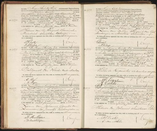No. 4870 Op heden Negen enTwwintig Juli Achttienhonderd Negen-en-Zeventig zijn voor ons ondergeteekende Ambtenaar van den Burgerlijken Stand der Gemeente Amsterdam, verschenen. van beroep, Jacobus hriste aanspreker oud vierenveertig aren, wonende schapensteeg N 3. bekende van de Overledene, en Johannes Alesie van beroep Aanspreker oud vierenvyftig Jaren, wonende te Nieuwer Amstel bekende van de Overledene, welke hebben verklaard, dat op Achtentwintig dezer des voor middags ten drie ure, in het huis, staande Amstelfdijk.- Kanton 2. No. 13, is overleden Elisabeth Dekker van beroep - geeen wonende als boven in den ouderdom van vier en zeventig jaren geboren te Zaandam. Weduwe van August Hunrich Friedrich Christiaan Oostmeijer En hebben wij hiervan opgemaakt deze Akte, welke na voorlezing door de aangevers en ons is onderteekend. IKreste Lriessen. 1. No. 4873 7 „ Op heden Negen en twintig Juli achttienhonderd Negen-en-Zeventig zijn voor ons ondergeteekende Ambtenaar van den Burgerlijken Stand der Gemeente Amsterdam, verschenen: Cornelis van Donk. van beroep aangrreker oud negen en veertig Jaren wonende ferdinand Bolstraat 62 bekende van de Overledene, en Aalt knaap.- van beroep aanspreker oud Dertig Jaren, wonende vinkenstraat 76 bekende van de Overledene, welke hebben verklaard, dat op zesentwintig dezer des na middags