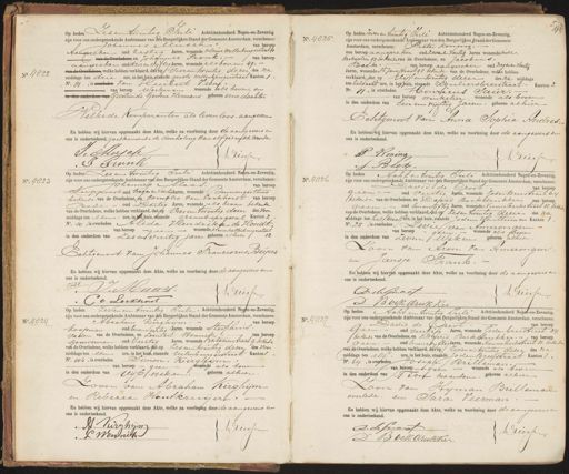5 No 4822 Op heden zesentwintig Juli Achttienhonderd Negen-en-Zeventig, zijn voor ons ondergeteekende Ambtenaar van den Burgerlijken Stand der Gemeente Amsterdam, verschenen: Johannes Musch. van beroep Aanspreker oud zestig Jaren, wonende kleine wittenburgerstraat 40 van de Overledene en Johannes Fronk. van beroep aanspreker oud drie en vyftig Jaren, wonende als boven 49. van de Overledene, welke hebben verklaard, dat opvieren twintig dezer des na middags ten drie ure, in het huis, staande groote willenbugerstraat Kanton 1 No. 81, is overleden van Huibert 1een van beroep Werkman wonende als boven, en in den ouderdem van Geertruida Gerdina Hermans geboren eene dochter 4 Velke de Komparanten, als leven loos, aangeven En hebben wij hiervan opgemaakt deze Akte, welke na voorlezing door de aangevers en ons is onderteekend. goedkeurende de doorhaling van elf gedrukte woorden . 1 10 „ S Mol v Driessen truns S No. 4825 Wz Op heden Zeven en twintig Juli Achttienhonderd Negen-en-Zeventig, zijn voor ons ondergeteekende Ambtenaar van den Burgerlijken Stand der Gemeente Amsterdam, verschenen: Pieter Koning. van beroep aanspreker oud zeven en Veertig Jaren wonende oude. kerksplein 93 bekende van de Overledene, en Jacobus. Reek van beroep aanspreker oud negen en Veertig Jaren, wonende St Jansstraat 45 bekende van de Overledene, welke hebben verklaard, dat op vijfen twintig dezer des na middags, ten half acht ure, in het huis, staande reguliersbreestraat Kanton 2 No. 11, is overleden Henricus Saur. -van beroep winkelier wonende als boven in den ouderdom van Een en vijftig jaren geboren alhier