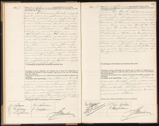 No. 17 Heden twaalf Januarinegentienhonderd acht en dertig verschenen voor mij Ambtenaar van den Burgerlijken Stand van Amsterdam, ten einde een huwelijk aan te gaan: van Nassau, Jacob, maga„ zijnbediende, geboren en wo¬ nende alhier, oud vijfentwintig Jaren, meerderjarige zoon van: van Nassau, Antonie, oud zesenzeventig jaren, zonder beroep, wonende alhier en Kaar, Aag je, overleden, en Wieffering, Hillegonda, kleerenperster geboren en we nende alhier, oud drie en twintig jaren, meerderjarige dochter van: Wieffering, Manus, overleden, en Wassenaar, Johanna, oud drieenveertig jaren, zonder beroep, wonende alhier. Di vader des bruidegoms en de meeder der bruid verklaarden mij toestemming tot dit huwelijk te geven De afkondiging tot dit huwelijk is onverhinderd geschied, alhier Bruidegom en bruid verklaarden mij, elkander aan te nemen tot echtgenooten en getrouwelijk alle plichten te zullen vervullen, welke door de wet aan den huwelijken staat zijn verbonden. Daarop heb ik, in naam der wet, verklaard, dat zij door het huwelijk aan elkander zijn verbonden. Als getuigen waren tegenwoordig: van Nassau, Cornelis werkman oud acht en veertig jaren en van Nossau, Gerar dus, fabrieksarbeider, oud negenentwintig jaren, beiden broeder des bruidegomsen wo¬ nende alhier. De vader des hundegams heeft niet geteekend, om dat zij niet hon schrijven Waarvan akte, welke overeenkomstig de wet is voorgelezen. No. 18 Heden twaalf Januari negentienhonderd acht en dertig verschenen voor mij, Jmbtenaar van den Burgerlijken Stand van Amsterdam, ten einde een huwelijk aan te gaan: van der Snek, Antoon, vrolist geboren te Haarlem, wonende alhier oud vijf en dertig jaren, van echt gescheiden echtgenoot van: Veld, huizen, Johanna, meerderjarige zoon van: van der Spek, Cornelis en van Lent, Hendrika, beiden zon der beroep en wonende te Haarlem, en Polman, Helena Catharina zonder beroep, geboren te Amhem wonende alhier, oud vyfendertig jaren, meerderjarige dochter van: Polman, Johannes Gerardus, overleden en Overdreef Hendri na, zonder beroep, wonende te Berlijn in Duitschland. De afkondiging tot dit huwelijk is onverhinderd geschied, alhier Bruidegom en bruid verklaarden mij, elkander aan te nemen tot echtgenooten en getrouwelijk alle plichten te zullen vervullen, welke door de wet aan den huwelijken staat zijn verbonden. Daarop heb ik, in naam der wet, verklaard, dat zij door het huwelijk aan elkander zijn verbonden. dls getuigen waren tegenwoordig: de Jong, Flora, zonder beroep, oud achten veer. tig jaren en stoppelman. Elisabeth, koopvrouw, oud zeven en dertig jaren, beiden wonende alhier. C v Nartau Jo Wanau G. v. Aassaa G: Wielfering 80 J. Wassenaar A Maatium Avde Ad F: van Gelder E Hoppelman HH: Jaataaren