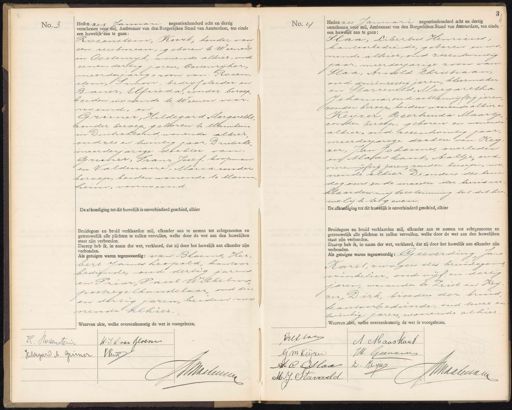 No. 3 Heden zes Jannari negentienhonderd acht en dertig verschenen voor mij, Ambtenaar van den Burgerlijken Stand van Amsterdam, ten einde een huwelijkaan te gaan: Rosenstem, Kurt, houder van een reisbureau, geboren te Weenen in Oostenvijk, wonende alhier, oud eenen dertig jaren, Oostenrijker, meerderjarige zoon van Rosen„ stem, Simon, bedrijfsleider en Baner, Elfrieda, zonder beroep beiden wonende te Weenen voor¬ noemd, en Gruner, Hildegard Margarethe zonder beroep, geboren te Marnherm in Duitschland, wonende alhier oud zes en twintig jaar, Duitsche meerderjarige dichter van: Gruner, Franz Josef, koopman en Valdenaire, Maria, zonder beroep, beiden wonende te Marn herm, voornoemd. De afkondiging tot dit huwelijk is onverhinderd geschied, alhier. Bruidegom en bruid verklaarden mij, elkander aan te nemen tot echtgenooten en getrouwelijk alle plichten te zullen vervullen, welke door de wet aan den huwelijken staat zijn verbonden. Daarop heb ik, in naam der wet, verklaard, dat zij door het huwelijk aan elkander zijn verbonden. Als getuigen waren tegenwoordig: van Bloemen Her¬ bert James Leopold, kantoor bediende, oud dertig jaren. en Prior, Paul Wilhelm, postzegelhandelaar, oud drie en dertig jaren, beiden wo nende alhier. Waarvan akte, welke overeenkomstig de wet is voorgelezen. No. 4 Heden zes Januari negentienhonderd acht en dertig verschenen voor mij, Ambtenaar van den Burgerlijken Stand van Amsterdam, ten einde een huwelijk aan te gaan: Slaa, Libertus Henricus; kantoorbediende, geboren en wi nende alhier, oud zesentwintig jaar, meerderjarige zoon van Slaa, Arnold Christraan, oud drieënzestig jaren, kleermaker, en Starreveld, Margaretha Johanna, oud achtenvijftig jaren zonder beroep, beiden wonende alhier, en Keijzer Geertruida Maartje, zonder beroep, geboren en wonende alhier, oud zesentwintig jaar, meerderjarige dochter van Keij zer, Jan Johannes, overleden. en Majaskant, Aaltje oud vierenvijftig jaren, zonder beroep, wi nende alhier. De ouders des bui degoins en de moeder der buuid ver klaarden mij toestemming tot dit hu welijk te geven De afkondiging tot dit huwelijk is onverhinderd geschied, alhier Bruidegom en bruid verklaarden mij, elkander aan te nemen tot echtgenooten en getrouwelijk alle plichten te zullen vervullen, welke door de wet aan den huwelijken staat zijn verbonden. Daarop heb ik, in naam der wet, verklaard, dat zij door het huwelijk aan elkander zijn verbonden. dds getuigen waren tegenwoordig: Geeverding Jan Karel, zwager des bruidego winkelier, oud vyf en dertig jaren, wonende te Leut en Keij zer, Dirk, broeder der bruid. kantoorbediende, oud twee en twintig jaren, wonende alhier. Waarvan akte, welke overeenkomstig de wet is voorgelezen. H. Rosensteur W:J: L. ven Gloem Jldegard ik Zruner Vurs J Paetenen Diessan A MaasSant Jk Geenein J.M Keezer D C Slaas D. Kijns AMaaleuau MJ. Starreveld