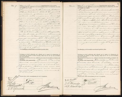 No. 9 Heden zes Jamivari negentienhonderd acht en dertig verschenen voor mij, Ambtenaar van den Burgerlijken Stand van Amsterdam, ten einde een huwelijk aan te gaan: Sunnotel Frederik Johan Christiaan, klerk ter gemeente secretarie, geboren en wonende alhier, oud negen en twintig jaren, meerderjarige zoon van Junnssel, Frederik Joha Christiaan oud drieenvijftig jaren, agent van politie en Gleuwink. Catharina Antonia, oud drie en vijftig jaren, zonder beroep, beiden wonende alhier, en Bakker, Cornelia Margaretha zonder beroep, geboren en wonende alhier, oud dertig jaren, meerderjarige dochter van: Bakker, Johannes Jan, tijpograaf wonende alhier en Braam, Helena overleden. De ouders des bruidegoms verklaarden mij loestemming to dit huwelijk te gezien De afkondiging tot dit huwelijk is onverhinderd geschied, alhier Bruidegom en bruid verklaarden mij, elkander aan te nemen tot echtgenooten en getrouwelijk alle plichten te zullen vervullen, welke door de wet aan den huwelijken staat zijn verbonden. Daarop heb ik, in naam der wet, verklaard, dat zij door het huwelijk aan elkander zijn verbonden. Als getuigen waren tegenoondig: Groot, Paulus sid, oud vierenveertig jaren, wonende alhier, en Bakker, Johannes, oom der bruid, uitgever, oud zeven envijftig jaren, wonende te B. Herenk No.10 Heden twaalf Januari negentienhonderd acht en dertig verschenen voor mij, Ambtenaar van den Burgerlijken Stand van Amsterdam, ten einde een huwelijk aan tegaan: Schouten, Hendricus Antonius, étaleur, geboren en wonende alhier, oud dertig jaar, meerderjarige zoon van: Schouten. Jsephus Antonius Gerardus en Brockhoff, Elisabeth Maria beiden overleden, en Klaverslijn, Johanna Pauling zonder beroep, geboren en wonen de alhier, oud drieëntwintigjaar meerderjarige dachter va Klaverstijn, Aloynus Henricus oud vijftig jaren, winkelier, wo nende alhier en Emons, Catha rina Maria, overleden, De vader der bruid verklaardenijkeslen ming tot dit huwelijk te geven De afkondiging tot dit huwelijk is onverhinderd geschied, alhier Bruidegom en bruid verklaarden mij, elkander aan te nemen tot echtgenooten en getrouwelijk alle plichten te zullen vervullen, welke door de wet aan den huwelijken Staat zijn verbonden. Daarop heb ik, in naam der wet, verklaard, dat zij door het huwelijk aan elkander zijn verbonden. dds getuigen waren tegenwoordig: Kloverstijn, Johannes. broeder der bruid, bakker, oud zevenentwintig jaren en Schouten Jorephus Martinus Gerardus broeder des bruidegoms, handels vertegenwoordiger, oud vijf en vijftig jaren, beiden wonende alHier Waarvan akte, welke overeenkomstig de wet is voorgelezen. 1 V Gror Bakke CHBakkera JCSemmdtel N AMaatieeen a.A Gleuunk H. A. Schout Wdamendg Jn Schouten J: P: Klaverstijn MH Klaverstin maaleeeen „