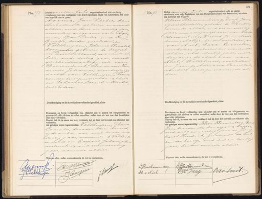 No. 72 Heden veertien Juli negentienhonderd acht en dertig verschenen voor mij, Ambtenaar van den Burgerlijken Stand van Amsterdam, ten einde een huwelijk aan te gaan: Agema, Jan Pieter, kan„ toorbediende, geboren en wonende alhier, oud drie en veertig jaar, meerderjarige zoon van: Age„ ma, Jan Pieter en de Leerm, Geertje, beiden overleden, en Velshuizen, Johanna Elisabet, koopvrouw, geboren te Oespel in Duitschland, wonende al¬ hier, oud dertig jaar, van echt gescheiden echtgenoote van: Beerendonk, Theodorus Hen¬ dricus Johannes, meerderjarige dochter van: Velthuyzen, Petrus, zonder beroep, wonende alhier en Scheeres, Cornelia Elisabet, overleden. De afkondiging tot dit huwelijk is onverhinderd geschied, alhier Bruidegom en bruid verklaarden mij, elkander aan te nemen tot echtgenooten en getrouwelijk alle plichten te zullen vervullen, welke door de wet aan den huwelijken staat zijn verbonden. Daarop heb ik, in naam der wet, verklaard, dat zij door het huwelijk aan elkander zijn verbonden. Als getuigen waren tegenwoordig: Velthuijzen Pelrus Cornelis, broeder der bruid¬ rijksambtenaar, oud twee en dertig jaar, wonende te Valkens„ waard en Carpers, Johan, pikeur mstmeleur, oud zesen veertig jaar, wonende alhier. Waarvan akte, welke overeenkomstig de wet is voorgelezen. No. 73 Heden twintig Juli negentienhonderd acht en dertig verschenen voor mij Ambtenaar van den Burgerlijken Stand van Amsterdam, ten einde een huwelijk aan te gaan: Klein Klouwenburg, Derk Jan rij wielhersteller, geboren te Deventer, wonende alhier, oud zes en veertig jaar, meerderjarige zoon van: Klein Klouwenburg, Berend Jan en Neute boom, Aaltje, beiden overleden, en van Niel, Sara Cornelia werkster, geboren en wonende alhier, oud dertig jaar, meer derjarige dochter van: van Niel, Wilhelmus, overleden en Jung Adriana Cornelia zonder beroep, wonende al¬ hier. De afkondiging tot dit huwelijk is onverhinderd geschied, alhier. Bruidegom en bruid verklaarden mij, elkander aan te nemen tot echtgenooten en getrouwelijk alle plichten te zullen vervullen, welke door de wet aan den huwelijken Staat zijn verbonden. Daarop heb ik, in naam der wet, verklaard, dat zij door het huwelijk aan elkander zijn verbonden. dds getuigen waren tegenwoordig: Klein Klouwenburg, Beren Jan, broeder des bruidegoms, kapper, oud acht en veertig jaar en Jung Carel Hendrik, groowader der bruid zonder beroep, oud drie en tachtig jaar, beiden wonende alhier. Waarvan akte, welke overeenkomstig de wet is voorgelezen. CeMr Aaenrt 1 J Cars J0 elthuijzen 7 DJaarlkomenbeerg BJMiMa2 Jang van Soest. D.C. v. Niel