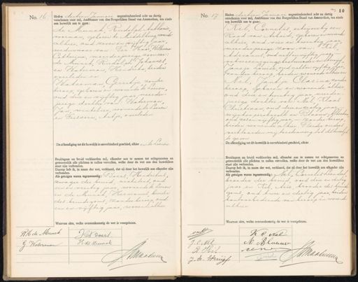 No. 16. Heden dertien Januari negentienhonderd acht en dertig verschenen voor mij, Ambtenaar van den Burgerlijken Stand van Amsterdam, ten einde een huwelijk aan te gaan: de Munck Rudolph Anthonie voorman, geboren te Middelburg, wonende alhier, oud zeven en vijftig jaar, weduwnaar van: Ter Haar, Willemina Catharina meerderjarige zoon van: de Munck, Rudolph Johannes en Waterman, Hendrika, beiden overleden en Waterman Gerritje zonder beroep, geboren en wonende te Loenen oud drie en vijftig jaar meerder: jarige dochter van: Waterman Jan winkelier wonende te Loenen en Priscorn, Antje, overleden. De afkondiging tot dit huwelijk is onverhinderd geschied, alhier en te Loenen. Bruidegom en bruid verklaarden mij, elkander aan te nemen tot echtgenooten en getrouwelijk alle plichten te zullen vervullen, welke door de wet aan den huwelijken staat zijn verbonden. Daarop heb ik, in naam der wet, verklaard, dat zij door het huwelijk aan elkander zijn verbonden. Als getuigen waren tegenwoordig: Boers Hendrikus. zwager der bruid architect, oud een en veertig jaar wonende te Loenen en de Munck Hermanus broeder des bruidegoms zonder beroep, oud een en vijftig jaar, wonende alhier. Waarvan akte, welke overeenkomstig de wet is voorgelezen. No. 17 Heden Zertien Januari negentienhonderd acht en dertig 20 verschenen voor mij, Ambtenaar van den Burgerlijken Stand van Amsterdam, ten einde een huwelijk aan te gaan: Kil Cornelis schrijver bij een Raad van Arbeid, geboren en wonende alhier oud vier en twintig jaar meerderjarige zoon van: Ril Adrianus, oud acht en vijftig jaar vak vereenigingsbestuurder en struyf, Jansje Louise, oud acht en vijftig jaar, zonder beroep, beiden wonende alhier en Nel, Jantje Clasina zonder beroep, geboren en wonende alhier oud drie en twintig jaar meerder jarige dochter van: Nel Klaas Christiaan, oud drie en zestig jaar wijnkoopersknecht en Blaauw Alberdina oud zes en vijftig jaar, — zonder beroep beiden wonende alhier. Beider ouders verklaarden mij toestemming tot dit huwelijk te geven. De afkondiging tot dit huwelijk is onverhinderd geschied, alhier. Bruidegom en bruid verklaarden mij, elkander aan te nemen tot echtgenooten en getrouwelijk alle plichten te zullen vervullen, welke door de wet aan den huwelijken Staat zijn verbonden. Daarop heb ik, in naam der wet, verklaard, dat zij door het huwelijk aan elkander zijn verbonden. dds getuigen waren tegenwoordig: Nel, Cornelis Leendert broeder der bruid, oud drie en dertig jaar en Kil, Arie broeder des bruide goms oud twee en dertig jaar beiden. kantoorbediende van beroep en wonende alhier. Waarvan akte, welke overeenkomstig de wet is voorgelezen. RH de Munck. HBVoert. H de Munck G. Waterman Maatin o K C Nel 7 M Blauw J C. Nel een A. Til J Smaaleee vut J.E. Wrwijf