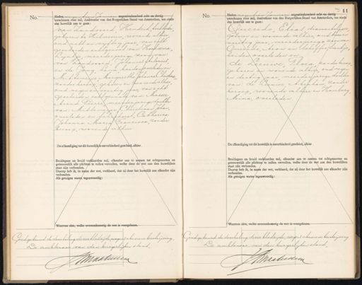 No. Januari negentienhonderd acht en P verschenen voor mij, Ambtenaar van den Burgerlijken Stand van Amsterdam, ten einde een huwelijk aan te gaan: van Zandvoord Hendrik, boekbinder geboren te Hilversum, wonende alhier oud acht en vijftig jaar van echt gescheiden echtgenoot van: Hoeksema Zijntje, meerderjarige zoon van van Zandvoord, Johannes Antonius en de Jong, Lena beiden overleden en Mittemeyer Margaretha Johanna Christina zonder beroep, geboren en wonende alhier. oud negen en veertig jaar van echt gescheiden echtgenoote van: Massee Arend Pierre meerderjarige dochter van: Mittemeyer Christiaan Johan overleden en schiphorst, Catharina Johanna Maria Francisca, zonder beroep, wonende alhier. De afkondiging tot dit huwelijk is onverhinderd geschied, alhier. Bruidegom en bruid verklaarden mij, elkander aan te nemen tot echtgenooten en getrouwelijk alle plichten te zullen vervullen, welke door de wet aan den huwelijken staat zijn verbonden. Daarop heb ik, in naam der wet, verklaard, dat zij door het huwelijk aan elkander zijn verbonden. Als getuigen waren tegenwoordig: tig de wet is voorgelezen. Wanwvao alten wettoo No. ari negentienhonderd Heden verschenen Voor mij, Ambtenaar van den Burgerlijken Stand van Amsterdam, ten eind een huwelijk aan te gaan: Guerido, Elias diamantslijper geboren en wonende alhier, oud twee en veertig jaar, meerderjarige zoon van Ouerido, Aron en Scheffersientje beiden overleden en de Leeuwe, Plora zonder beroep geboren en wonende alhier, oud negen en dertig jaar meerderjarige dochter van: de Leeuwe Abraham zonder beroep, wonende alhier en Hamburg Mina, overleden. De afkondiging tot dit huwelijk is onverhinderd geschied, alhier. Bruidegom en bruid verklaarden mij, elkander aan te nemen tot echtgenooten en getrouwelijk alle plichten te zullen vervullen, welke door de wet aan den huwelijken staat zijn verbonden. Daarop heb ik, in naam der wet, verklaard, dat zij door het huwelijk aan elkander zijn verbonden. Als getuigen waren tegenwoordig: s de wet is voorge (Waarvan akte, welke overeen Vedgekeurd de doorhaling dezer bladzijle wegen sabusiere beschrijving. De ambtenaar van den burgerlijken stand, JSmaatinn vedgekeurd de doorhaling dezer bladzijde, wegens abusieve beschrijving De ambtenaar van den burgerlijken stand JMaalienn