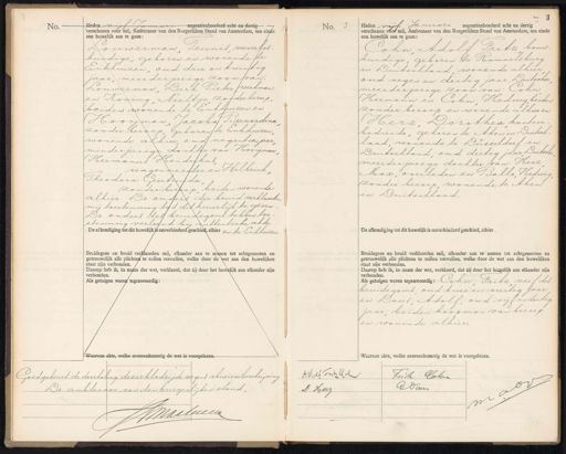 No. negentenhonderd acht en derti Heden vijf Jan. verschenen voor mij, Ambtenaar van den Burgerlijken Stand van Amsterdam, ten einde een huwelijk aan te gaan: Louwerman, Teunis veeverloo kundige, geboren en wonende te Enkhuizen, oud drie en twintig jaar, meerderjarige zoon pan: Louwerman, Dirk Pieter /werkman en Koning, Neeltje zonder beroep beiden wonende te Enkhuizen en Hooyman, Jacoba Bernardina zonder beroep, geboren te Enkhuizen. wonende alhier oud negentien jaar, minderjarige dochter van: Hooyman Hermanus Hendrikus, wagenmeester en Wilbrink, Theodora Geertruida zonder beroep, beiden wonende alhier. De ouders der bruid verklaarden mij toestemming tot dit huwelijk te geven. De ouders des bruidegoms hebben toe stemming verleend bij authentieke akte De afkondiging tot dit huwelijk is onverhinderd geschied, alhier en te Enkhuizen. Bruidegom en bruid verklaarden mij, elkander aan te nemen tot echtgenooten en getrouwelijk alle plichten te zullen vervullen, welke door de wet aan den huwelijken staat zijn verbonden. Daarop heb ik, in naam der wet, verklaard, dat zij door het huwelijk aan elkander zijn verbonden Als getuigen waren tegenwoordig: Waarvan akte, welke overeenkomstig de wet is voorgelezen. No. 3 3 Heden vijf Januari negentienhonderd acht en dertig verschenen vool mij, Ambtenaar van den Burgerlijken Stand van Amsterdam, ten einde een huwelijk aan te gaan: John, Adolf Fritz bouw kundige, geboren te Rummelsburg in Duitschland, wonende alhier. oud negen en dertig jaar, Duitscher meerderjarige zoon van: Cohn Hermann en Cohn, Hedwig, beiden zonder beroep en wonende alhier en Herz Dorothea kantoor bediende, geboren te Aken in Duitsch land, wonende te Dusseldorf in Duitschland, oud dertig jaar Duitsche meerderjarige dochter van: Herz Mak, overleden en Ballo, Hedwig zonder beroep wonende te Aken, in Duitschland. De afkondiging tot dit huwelijk is onverhinderd geschied, alhier. Bruidegom en bruid verklaarden mij, elkander aan te nemen tot echtgenooten en getrouwelijk alle plichten te zullen vervullen, welke door de wet aan den huwelijken staat zijn verbonden. Daarop heb ik, in naam der wet, verklaard, dat zij door het huwelijk aan elkander zijn verbonden. als getuigen waren tegenwoordig: Cohn, Fritz neef des bruidegoms oud twee en veertig jaar en Daus, Adolf, oud vijf en dertig jaar, beiden koopman van beroep, en wonende alhier. Waarvan akte, welke overeenkomstig de wet is voorgelezen. Goedgekeurd de doorhaling dezer bladzijde wegens abusiere beschrijving De ambtenaar van den burgerlijken stand; JMaateeen „ Jnzun Trik Coh D A dau D. Horz