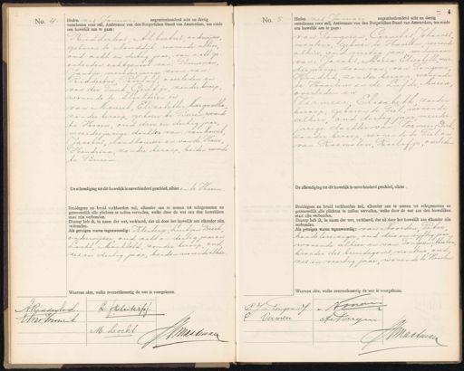 No. 4. Heden zes Januari negentienhonderd acht en dertig verschenen voor mij, Ambtenaar van den Burgerlijken Stand van Amsterdam, ten einde een huwelijk aan te gaan: Ridderbos Albertus onderwijzer, geboren te Noorddijk, wonende alhier, oud acht en dertig jaar, van echt ge¬ scheiden echtgenoot van: Buurman. Jantje, meerderjarige zoon van: Ridderbos Hoelof, overleden en van der Tunk Grietje, zonder beroep, wonende te slochteren en van Mourik, Elizabeth Margaretha zonder beroep, geboren te Buren, wonende te Hoorn, oud drie en dertig jaar, meerderjarige dochter van: van Mourik Jacobus, landbouwer en van de Haar, Hendrina, zonder beroep, beiden wonende te Buren. De afkondiging tot dit huwelijk is onverhinderd geschied, alhier en te Hoorn. Bruidegom en bruid verklaarden mij, elkander aan te nemen tot echtgenooten en getrouwelijk alle plichten te zullen vervullen, welke door de wet aan den huwelijken staat zijn verbonden. Daarop heb ik, in naam der wet, verklaard, dat zij door het huwelijk aan elkander zijn verbonden. Als getuigen waren tegenwoordig: Kleiterp, Zuitjen Freerk onderwijzer oud acht en dertig jaar en Locht, Machteld, zonder beroep, oud zes en dertig jaar, beiden wonende alhier. Waarvan akte, welke overeenkomstig de wet is voorgelezen. No. 5 Heden Zes Januari negentienhonderd acht en dertig verschenen voor mij, Ambtenaar van den Burgerlijken Stand van Amsterdam, ten einde een huwelijk aan te gaan: van Tongeren, Cornelis Johannes monteur, geboren te Haarlem, wonende alhier, oud veertig jaar weduwnaar van: Jacobs Maria Elisabeth, meer derjarige zoon van: van Tongeren Hendrik zonder beroep wonende te Haarlem en de Liefde, Maria overleden en Vermeer Elisabeth zonder beroep, geboren te Tiel, wonende alhier oud dertig jaar meerder jarige dochter van: Vermeer Dirk zonder beroep wonende te Tiel en van Rosmalen, Roelofje overleden De afkondiging tot dit huwelijk is onverhinderd geschied, alhier, Bruidegom en bruid verklaarden mij, elkander aan te nemen tot echtgenooten en getrouwelijk alle plichten te zullen vervullen, welke door de wet aan den huwelijken staat zijn verbonden. Daarop heb ik, in naam der wet, verklaard, dat zij door het huwelijk aan elkander zijn verbonden. Als getuigen waren tegenwoordig: van Noorden Peter handelsreiziger, oud drie en vijftig jaar, wonende alhier en van Tongeren Abraham broeder des bruidegoms, monteur oud zes en veertig jaar wonende te Haarlem Waarvan akte, welke overeenkomstig de wet is voorgelezen. L: Hleitert H: RiddenboL. AnrMourik M. Locht Maatnau C. J a LongourJ Noordi Vermeer Aitongin JMarteuzen