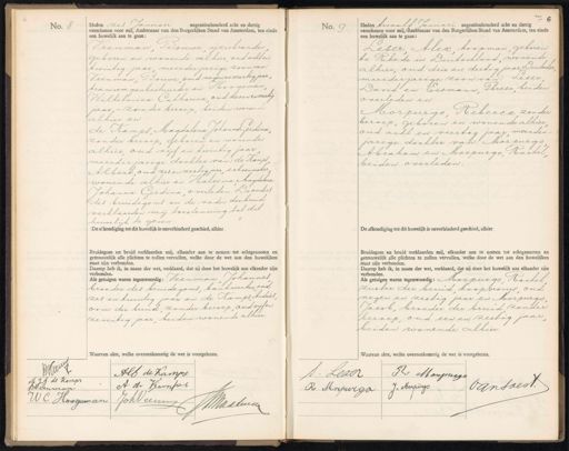 No. 8. Heden zes Januari negentienhonderd acht en dertig verschenen voor mij, Ambtenaar van den Burgerlijken Stand van Amsterdam, ten einde een huwelijk aan te gaan: Veenman Bouwe ijzerbrander geboren en wonende alhier; oud acht en twintig jaar meerderjarige zoon van eenman, Bouwe oud negen en veertig jaar tramwagenbestuurder en Hoogeman Wilhelmina Catharina oud zeven en veertig jaar, - zonder beroep, beiden wonende alhier en de Kamps, Magdalena Johanna Gerdina zonder beroep, geboren en wonende alhier, oud vijf en twintig jaar meerderjarige dochter van: de Ramps Albert oud zes en zestig jaar schoenmaker wonende alhier en Halsema Magdalena Johanna Gerdina overleden. De ouders des bruidegoms en de vader der bruid verklaarden mij toestemming tot dit huwelijk te geven De afkondiging tot dit huwelijk is onverhinderd geschied, alhier, Bruidegom en bruid verklaarden mij, elkander aan te nemen-tot echtgenooten en getrouwelijk alle plichten te zullen vervullen, welke door de wet aan den huwelijken staat zijn verbonden. Daarop heb ik, in naam der wet, verklaard, dat zij door het huwelijk aan elkander zijn verbonden. Als getuigen waren tegenwoordig: Veenman Johannes, broeder des bruidegoms, bankwerker oud zes en twintig jaar en de Kamps Andries, oom der bruid, zonder beroep, oud vijfen zeventig jaar, beiden wonende alhier. Waarvan akte, welke overeenkomstig de wet is voorgelezen. No. 9. Heden twaalf Januari negentienhonderd acht en dertig verschenen voor mij, Ambtenaar van den Burgerlijken Stand van Amsterdam, ten einde een huwelijk aan te gaan: Leser Alex koopman, geboren te Rhede in Duitschland, wonende alhier, oud drie en dertig jaar Duitscher meerderjarige zoon van: Leser David en Eismann Threse beiden overleden en Morpurgo Rebecca zonder beroep, geboren en wonende alhier. oud acht en veertig jaar meerder jarige, dochter van: Morpurgo Abraham en Morpurgo, Rachel beiden overleden: De afkondiging tot dit huwelijk is onverhinderd geschied, alhier Bruidegom en bruid verklaarden mij, elkander aan te nemen tot echtgenooten en getrouwelijk alle plichten te zullen vervullen, welke door de wet aan den huwelijken Staat zijn verbonden. Daarop heb ik, in naam der wet, verklaard, dat zij door het huwelijk aan elkander zijn verbonden. Als getuigen waren tegenwoordig: Morpurgo, Rachel zuster der bruid koopvrouw, oud negen en zestig jaar en Morpiego Jacob; broeder der bruid zonder beroep, oud een en zestig jaar beiden wonende alhier. Waarvan akte, welke overeenkomstig de wet is voorgelezen. Kui Alb de Kamps J.G. de Kampe A de Krampe BVeenman W.C. Hoogeman JohVeern Jaaleeen 5 Ps Maupuije D: Lezer Van soest. J„ Morpiergo Re Anpurga