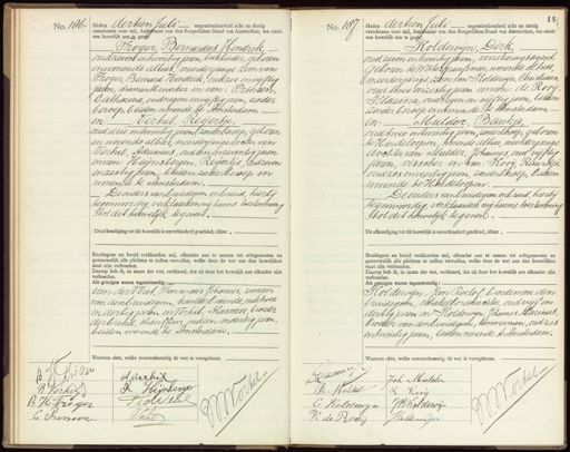 No. 186. Heden dertien Juli negentienhonderd acht en dertig verschenen voor mij, Ambtenaar van den Burgerlijken Stand van Amsterdam, ten einde een huwelijk aan te gaag Proger, Bernardus Hendrik, oudzeven entwintig jaren, boekbinder, geboren enwonende alhier meerderjarige zoon van Froger, Bernard Hendrik, oudzes envijftig jaren, diamantbewerker en van: Prinsen Catharina, oudnegen envijftig jaren, zonder beroep, beiden wonende te Amsterdam, en: — Verhil, Reijertje, oud drie entwintig jaren, zonder beroep, geboren en wonende alhier, meerderjarige doohter van Verhie, Adrianus, oud een enzeventig jaren en van: Heijnsbergen, Reijertje, oudzeven enzestig jaren, beiden zonder beroep en wonende te Amsterdam. De ouders van bundegom enbruid, hierbij tegenwoordig, verklaarden mij hunne toestemming Sot dit huwelijk tegeven. De afkondiging tot dit huwelijk is onverhinderd geschied, alhier . Bruidegom en bruid verklaarden mij, elkander aan te nemen tot echtgenooten en getrouwelijk alle plichten te zullen vervullen, welke door de wet aan den huwelijken staat zijn verbonden. Daarop heb ik, in naam der wet, verklaard, dat zij door het huwelijk aan elkander zijn verbonden. Als getuigen waren tegenwoordig:van der Vliet, Franciscus Johannes, zwager van denbuuidegen, kontoerbeirende, ond twee en dertig jaren en Verhil, Ahasveers, broeder derbrrd, chanffeur, ondeen ondertig jaren beiden wonende te Amsterdam. Waarvan akte, welke overeenkomstig de wet is voorgelezen. No. 187 Heden dertien Juli negentienhonderd acht en dertig verschenen voor mij, Ambtenaar van den Burgerlijken Stand van Amsterdam, ten einde een huwelijk aan te gaan Kolderin, Dirk, oud zeven entwintig jaren, verzekeringsagent, geboren te Watergraafsmeer, wonende alhier, meerderjarige zoon van Kolderijn, Christiaan, oud twee enzestig jaren en van: de Roog Klazina, oudnegen en vijftig jaren, beiden zonder beroep en wonende te Amsterdam, en — Mulder, Bankje oud twee entwintig jaren, zonderbrroep, geboren te Hindeloopen, wonende alhier, meerderjarige dochter van Mulder, Johannes oud vijftig jaren, visscher en van: Kooij Ruurdje, oudzes enveertig jaren, zonderberoep, beiden wonende teHindeloopen. Deouders vanlmudegom enbrind, hierby tegenwoordig, verklaarden mij hunne toestemming tot dit huwelijk tegeven. De afkondiging tot dit huwelijk is onverhinderd geschied, alhier. Bruidegom en bruid verklaarden mij, elkander aan te nemen tot echtgenooten en getrouwelijk alle plichten te zullen vervullen, welke door de wet aan den huwelijken staat zijn verbonden. Daarop heb ik, in naam der wet, verklaard, dat zij door het huwelijk aan elkander zijn verbonden. Als getuigen waren tegenwoordig: Roldewijn, Jan Roelof broedervan den brindegom, schakelbordwachter, oud vijf en dertig jaren en Koldewijn, Johannes Marinus broeder van denbruidegim, timmerman, oudzes entwintig jaren, beiden wonende te Amsterdam. N 9W A verhil B 7 L Heijnberiar P Verhel O Piosen B H: Vroger Aatr E Vurjsen. Aaan 3 Joh. Muleter B: Mulder R. Kooij. E Koldewyn JR Koldewyn K de Rooij Jkoldewesen