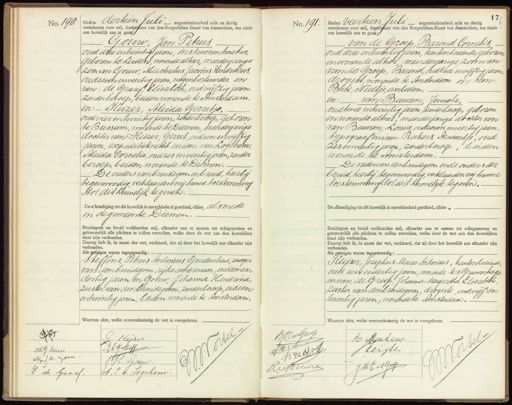 No. 190. Heden dertien Juli negentienhonderd acht en dertig verschenen voor mij, Ambtenaar van den Burgerlijken Stand van Amsterdam, ten einde een huwelijk aan te gaar; Gouw, Jan Petrus, oud drie entwintig jaren, instrumentmaker, geboren te Leiden, wonende alhier, meerderjarige zon van Goum, Machielus Jacobus Hendrikus, oudzeven enveertig jaren, nogenbestuurder en van: de Graaf, Elisaberh, oudvyftig jaren zonder beroep, beiden wonende te Amsterdam, en: — Keizer, Aleida Gerritje, oud vier entwintig jaren, zonder beroep, geboren te Bussum, wonende te Diemen, meerderjarige dochter van Keizer, Gerrit, oudien en vijftig jaren, expeditieknecht en van: van Logchem, Aleida Cornelia, oudzes enveertig jaren, zonder beroep, beiden wonende te Diemen. De ouders van bundeyem enbruid, hierby tegenwoordig verklaarden mij hunne toestemming tot dit huwelijk tegeven. De afkondiging tot dit huwelijk is onverhinderd geschied, alhier, alsmede in de gemeente Diemen. Bruidegom en bruid verklaarden mij, elkander aan te nemen tot echtgenooten en getrouwelijk alle plichten te zullen vervullen, welke door de wet aan den huwelijken staat zijn verbonden. Daarop heb ik, in naam der wet, verklaard, dat zij door het huwelijk aan elkander zijn verbonden. Als getuigen waren tegenwoordig: Steffens, Petrus Antonius Goudentius, zwager van den bundegom ryks ambtenaar, ondeenen dertig jaren en Goum Johanna Hendrina, zuster van den bruidegem, zonder beroep, oudeen entwintig jaren, beiden wonende te Amsterdam. No. 191. Heden veertien Juli negentienhonderd acht en dertig verschenen voor mij, Ambtehaar van den Burgerlijken Stand van Amsterdam, ten einde een huwelijk aan te gaah: van de Groet, Barend Cornelis, oud drie entwintig jaren, kantoorbediende, geboren en wonende alhier meerderjarige zoonvan van de Groep, Barend, oud twee en vijftig jaren drogist, wonende te Amsterdam en van: Bik, Neeltje, overleden. en: — van Buuren, Jenmeke oud twee entwintig jaren, zonder beroep, geboren en wonende alhier, meerderjarige dochter van van Buuren, Louis, oudzeven enveertig jaren Hyprgraaf en van: Rakers, Ariaantje, ond zes enveertig jaren, zonder beroep, beiden wonende te Amsterdam De vadervan denbundegem ende ouders de bruid, hierbij tegenwoordig, verklaarden mij hunne trestemming tot dit huwelijk tegeven- De afkondiging tot dit huwelijk is onverhinderd geschied, alhier . Bruidegom en bruid verklaarden mij, elkander aan te nemen tot echtgenooten en getrouwelijk alle plichten te zullen vervullen, welke door de wet aan den huwelijken Staat zijn verbonden. Daarop heb ik, in naam der wet, verklaard, dat zij door het huwelijk aan elkander zijn verbonden. Als getuigen waren tegenwoordig: Reijser, Josephus Maris Antonius, kantoorbediende oud een endertig jaren, wonende te's Gravenhage en van de Groep, Johanna Margaretha Elisabeth Zuster van denbrindegem, drogiste, oudvijf en twintig jaren, wonende te Amsterdam. Waarvan akte, welke overeenkomstig de wet is voorgelezen.