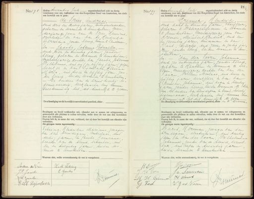 No 198 Heden twintig zuli negentienhonderd acht en dertig verschenen voor mij, Ambtenaar van den Burgerlijken Stand van Amsterdam, ten einde een huwelijk aan te gaan: de Vries Andreas oud drie en dertig jaren, antogeerlasscher geboren en wonende te Amsterdam meer derjarige zoon van de Pries Henricus overleden en van: van es Hendrika Gerredina, zonder beroep, wonende te Landsmeer en: — Jacobs Johanna Petronella, ouid vier en twintig jaren, zonder beroep geboren en wonende te Amstendam; meerdeljarige dochter van Jacobs, Johannes Wilhelmus, oud vy t en vijftig jaren, gops„ Werk er en van: Lijmbach, Clasina Maria, oud twee ten vijftig jaren, Jon der beroep, beiden wonende te Amsterdam. De buders van de bruidhierbij te„ gemdoordig, berk laarden mi hunne toestemmng tot dit hundelijk te geven. De afkondiging tot dit huwelijk is onverhinderd geschied, alhier. Bruidegom en bruid verklaarden mij, elkander aan te nemen tot echtgenooten en getrouwelijk alle plichten te zullen vervullen, welke door de wet aan den huwelijken staat zijn verbonden. Daarop heb ik, in naam der wet, verklaard, dat zij door het huwelijk aan elkander zijn verbonden. Als getuigen waren tegenwoordig: Vitsing, Hendrikus Marinus, Gwager van den bruidegam, metselaar, bud dertig jaren, en Jacobs, Coenraad broeder van de bruid, schuerder, bud len en twintig jaren, beijden wo- nende te Amsterdam.- Waarvan akte, welke overeenkomstig de wet is voorgelezen. No 199 Heden twintig Juli negentienhonderd acht en dertig verschenen voor mij, Ambtenaar van den Burgerlijken Stand van Amsterdam, ten einde een huwelijk aan te gaan: remer, Hendrik oud acht en twintig jaren, chautfeur geboren te Watergrachs meer en wovende te Amsterdam meerderjarige Joan van remer, Meindert Hendrik, oud een en zeventig jaren, tuinman en van. Root, Gurtje, tud zeven en zestig pa„ Een zonder beroep, beiden wonende te Am- sterdkm en: — van der Voorn, Johanna, oud zes en twintig jaren, onder beroep. geboren. te Haarlem en wonende te Die. Ien, meerderjarige dochter van van der born Willem Nicolaas, oud twee en vijftig jaren Winkelier en van: van Lleuwen, Johanna, oud negen en Veertig jaren, zonder beroep, beiden wonende te Die men. De buders van buidecom en buund, hierbij tegenwoordig, verklaarden mij hunre toe¬ stemming tot dit huwdik te geben- De afkondiging tot dit huwelijk is onverhinderd geschied, alhier en te Diemman Bruidegom en bruid verklaarden mij, elkander aan te nemen tot echtgenooten en getrouwelijk alle plichten te zullen vervullen, welke door de wet aan den huwelijken staat zijn verbonden. Daarop heb ik, in naam der wet, verklaard, dat zij door het huwelijk aan elkander zijn verbonden. Als getuigen waren tegenwoordig: Worst, Herman wager van den brin degom, eectricien, oud veertig jaren en van der Soorn. Mlhelumaa Johanna guster van de bezuid, dienst bad, bud negen en twintig jaren beiden wonende te Amsterdam Waarvan akte, welke overeenkomstig de wet is voorgelezen. Andria anrien H.M. Titting C Jocobi J.P. Jacobs.