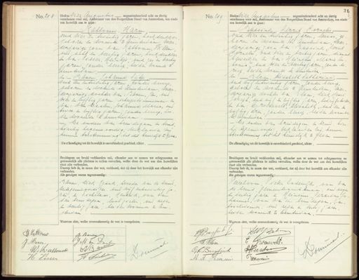 No. 218 Heden dier Augustus negentienhonderd acht en dertig verschenen voor mij, Ambtenaar van den Burgerlijken Stand van Amsterdam, ten einde een huwelijk aan te gaan: 5atbouw, Harn oud vier en twintig jaren, boekdrukker feb oren en wwonende te Amsterdam meer, deerjarige zoon van Kattouw, Wllem oud acht. en veertig jaren, boekdrukker ln ban: Visser, Huntje oud zes en veertig Jaren, zonder beroep, beiden wonende te mmsterdam, ln: — Banen Joh Anna lijtje oud een entwintig jaren zonder beroep, geboren en wonende te Amsterdam meer derjarige dochter van: Banen, Jan, bud vier en vijftig jaren, scheepstimmerinen li ban: van Daalen, Johanna Maria, bud twee en vijftig jaren, zonder beroep, beiden wonende te Amsterdam De ouder van brendegam en brud hierbij tegenwoordig, verklaarden mi hunne toestemming tot uit huwelijk te gevaDe afkondiging tot dit huwelijk is onverhinderd geschied, alhier. Bruidegom en bruid verklaarden mij, elkander aan te nemen tot echtgenooten en getrouwelijk alle plichten te zullen vervullen, welke door de wet aan den huwelijken staat zijn verbonden. Daarop heb ik, in naam der wet, verklaard, dat zij door het huwelijk aan elkander zijn verbonden. Als getuigen waren tegenwoordig: Banen, Dirk Szaak, broeder van de bruid tertegenwoordigen, oud vijf entwintig ja Een, en Dickelaar, Hendrik, vam van den bruidejam lood Pieter om negen en veertig jaren, beide wonende te Am. sterdam Waarvan akte, welke overeenkomstig de wet is voorgelezen. No. 219 31 Heden dilt Augustus negentienhonderd acht en dertig verschenen voor mij, Ambtenaar van den Burgerlijken Stand van Amsterdam, ten einde een huwelijk aan te gaan: Bussink Cerrit Cornelis oud vier en twintig jaren, lrair, geboren en wonende te Amsterdam, eerderjarige zoon van: Bussink, Serzit Sornelis, oud vier en veertig jaren, diemant bewerker en van: Heinsuus, Marie An. toug oud bier en veertigf uren ,zonder beroep beiden wonende te Amsterdam tn: Blom, Elisabeth Catharina, bud vijf en twintig jaren zonder beroep, geboren en wonende te Amsterdam, meerderjarige dochter tan: Slom, Dirk Heuri Joseph, beid vijf en vijftig jaren, bedrijfsleider le van: Groenevelt, Elisabeth, buk len en vijftig Jaren, jonder beroep, beiden wonende te Asterdaa De baders ban bruidegom en bruid, hierbij teeuw vordig, berk laarden mij, hunne toestemming tot dit huwelijk te geden De afkondiging tot dit huwelijk is onverhinderd geschied, alhier, Bruidegom en bruid verklaarden mij, elkander aan te nemen tot echtgenooten en getrouwelijk alle plichten te zullen vervullen, welke door de wet aan den huwelijken staat zijn verbonden. Daarop heb ik, in naam der wet, verklaard, dat zij door het huwelijk aan elkander zijn verbonden. Als getuigen waren tegenwoordig: Peereboom, Pieter Lodemjk, vam van de buuid, Cemeenteambtnaar, om negen te dertig jare en Hlinsius, Cerbedus fo. hannes, vam van Te buuidesben, anloosbeviende, bun hepen en dertig Caren, beide wonendt te lmterdam A: Rystouuw J Benen J. M va Daalen J: Banen Comeln DJ B an W Mastouwe J. Fichter H Visser Buskik Jr Jatzln E Grerevelt B. Blour Asmmen Peerboo GC. Bugfink Wansius M A Heinsius