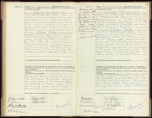 No. 224 Heden E en Augustus negentienhonderd acht en dertig verschenen voor mij, Ambtenaar van den Burgerlijken Stand van Amsterdam, ten einde een huwelijk aan te gaan: lijden van Amstel, Louis oud acht ten twintig jaren, Kapper, ge boten en wonende te Amsterdam meer derjarige zoon van: Leijden van Amstel aesb, oud zeven en vijftig jaren musicus len van: Salamans, Mariaune, oud bier en vijftig jaren, zender beroep, beiden wonende te amsberdkm, ln: — Norins, Esther, bued vijf en dertig jaren, zonder beroep, ge- baren en woonende te Amsterdam, meerder jarige dochter van: Worms, Jacob en Aan: Hes. Sara, beiden zonder beroep en wonende te Amsterdam. -De ouders van den bruidegom hierbij tepenwoordig, berklaarden mij hunne toe- stemmmng tot dit huwdelijk te geven. De afkondiging tot dit huwelijk is onverhinderd geschied, alhier , Bruidegom en bruid verklaarden mij, elkander aan te nemen tot echtgenooten en getrouwelijk alle plichten te zullen vervullen, welke door de wet aan den huwelijken staat zijn verbonden. Daarop heb ik, in naam der wet, verklaard, dat zij door het huwelijk aan elkander zijn verbonden. Als getuigen waren tegenwoordig: lijden van Amstel Mojes, broeder van den bruidegoen, loodgieter ben twee en dertig jaren. ler Brauk horst, Hartog Jwager van de bruid, Rapper bus len en dertig jaren, beiden wonende te Ams terdam Waarvan akte, welke overeenkomstig de wet is voorgelezen.- No. 221 Echtscheiding uitgesproken bij vornis dez Rechtbank te Amterdam van 29 September 1979, inge schreven te tenderdam, heden 8 Februari 1950. J Mro Heden A1 en Augustus negentienhonderd acht en dertig verschenen voor mij, Ambtenaar van den Burgerlijken Stand van Amsterdam, ten einde een huwelijk aan te gaan. — de Braij Dirk Nicolaas, beid vier en twintig jaren, Antomonteur, geboren te Watergraafsmeer, wonende te Amsterdam meerderjarige van van: de Craij DirkAicolaas oud bier en vijftig jaren tuinnan en van: schaap M Ario, oudaehf en vijftig jaren, zonder beroep, beiden wonende te Huiterdam ln. — Jokklina, Prijntje, oud vier entwintig jaren, gonder beroep, beboren te Hoorn, wonende te Amsterdam meerderjarige dochter ta: Fokkema. Krien. bud len en vijftig aren, faliieks abeider- lr ta: de Boer, kinske, bud len en vijftig shren, zonder beroep, beiden warende a Amtervam. De baders tan bruidegoen en bund, hierb Egeuwoordig, verklaarde mij huune toe¬ stemmming tot dit huwelijk te geven De afkondiging tot dit huwelijk is onverhinderd geschied, alhier. - Bruidegom en bruid verklaarden mij, elkander aan te nemen tot echtgenooten en getrouwelijk alle plichten te zullen vervullen, welke door de wet aan den huwelijken staat zijn verbonden. Daarop heb ik, in naam der wet, verklaard, dat zij door het huwelijk aan elkander zijn verbonden. Als getuigen waren tegenwoordig:- Sijffers, Joseph Wllibrordus, swager van den brindezom, zij wielhandelaar, oud acht ln dertig jaren Ten Fokkema, Jansje, Jus te van de bruid, zonder beroep, bud jeven en twintig jaren, beiden wonende te Amsterdam Waarvan akte, welke overeenkomstig de wet is voorgelezen. Alijsennt L. Leyden v. Amssel H Brootbes E: Worms. 13