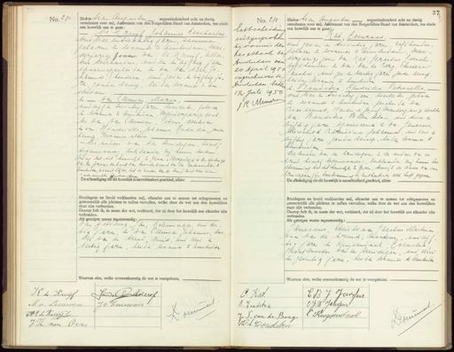 No. 230 Heden Hen Aupustus negentienhonderd acht en dertig , verschenen voor mij, Ambtenaar van den Burgerlijken Stand van Amsterdam, ten einde een huwelijk aan te gaan: De Kruyf, Johannes Everhardus, ouid vier ensedcntig jaren, Aannemer heb oren bn wonende te Amsterdam, meer- derjarige zoana van: de Kruijf, alber. tus Evernardus, oud een en vijftig jaren. Spoorweparbeider en ban: van Vers, 7o¬ hanna Theodora, bud zeven en viftig fo- ren zonder beroep, ber den wonende te km- sterdam en: — van Lleuwen, Maria vun vijf en twintig jaren werkster, febo vn ln wonende te Amsterdam, meerderjarige doch- ter van: van Lleuuden, Fetrus sterkd en te van: Hindricks, Jobanna Hendrika, zonder beroep, wonende alhier. De auders van den huiderten, hierbj tegenwoordig, berk landen hij henne toertem„ ming tot dit huwelk te glaen -vergelegd is een afschrift van Een proces berbaal van tusschen komst van den Kantonrechter a Amsterdam, waaruit blijkt, dat de moeder van de buend niet voor dien aito nechter 10verschenen. De afkondiging tot dit huwelijk is onverhinderd geschied, alhier. Bruidegom en bruid verklaarden mij, elkander aan te nemen tot echtgenooten en getrouwelijk alle plichten te zullen vervullen, welke door de wet aan den huwelijken staat zijn verbonden. Daarop heb ik, in naam der wet, verklaard, dat zij door het huwelijk aan elkander zijn verbonden. Als getuigen waren tegenwoordig: van Gelderop, Jan, Roleuwerker, bun der tig jaren, len van Lleuwen Johannes, broe- ver van de blend Muid, beid drie en dertig jaren, heiden wonende te Amsterdam Waarvan akte, welke overeenkomstig de wet is voorgelezen. No. 231 hehtscheiden No 231 uitgesproken bij vonnis der Rechtbank ter Amsterdam van 20 April 1959 ingeschieven te Amdterdam heden 12 Juli 1950 JC Mem een huwelijk aan te gaan: Heden t1 en Augustus negentienhonderd acht en dertig verschenen voor mij, Ambtenaar van den Burgerlijken Stand van Amsterdam, ten einde Kab Coenraad. bud zev en en twintig Jaren, Cofihouder Deboten en wonende te Amsterdam, meer derjarige, zoon van: Kat, Geraidus Cornelis Cot ihander en ban: van de Berg, Theodora Jacoba ond zes en veertig jaren sonde beroep, beide ovende te Amterten.- ih: Woudstra Hendrika Petronella, oud ver en twintig jaren Werkster, geboren le wonende te Amsterdam, gescher de tan Bies bronck, endrik Joses Meerderjanje dochter Aan: Woudstra, Wllen Caton, oud twee en vijftig jaren tjouwerma t ta: Janssens, Elisabeth Berendina Johanna vun drie en vijftig Jare, zonder beroep, beiden wonende te Eumberan De meder ban den bruidegam ten de buders van de brund, hierbij tegenwoordig, verklaarde mij huun toe stemming tot det huwelijk te geven, terwijl de bader van den bruidepan zijn toestemming bij authertieke akte heeft gegeven- De afkondiging tot dit huwelijk is onverhinderd geschied, alhier, Bruidegom en bruid verklaarden mij, elkander aan te nemen tot echtgenooten en getrouwelijk alle plichten te zullen vervullen, welke door de wet aan den huwelijken staat zijn verbonden. Daarop heb ik, in naam der wet, verklaard, dat zij door het huwelijk aan elkander zijn verbonden. Als getuigen waren tegenwoordig: Jaussens Chris ti aan Jacobus Martinas bam van de bruid, kouteur, ur n tig jaren en Ruijsendaal, Cornelis Groof moeder van den bruidegan, oud drie een zeventig jaren, beiden wonende te Amterdae Waarvan akte, welke overeenkomstig de wet is voorgelezen. K de Kruijf Lan da Zelderof M v Leeuwen J.V Leeuwen Cr A E. de Kruyjl 1 J I van Pers C: Kat. EB.J. Jarser CJH Janssen R. Houdstra J I. van de Berg. Rugjendaal