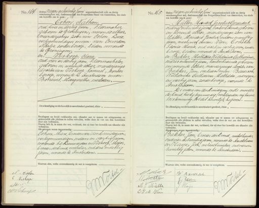 No. 164. Heden negen en twintig Juni negentienhonderd acht en dertig verschenen voor mij, Ambtenaar van den Burgerlijken Stand van Amsterdam, ten einde een huwelijk aan te gaan: Cohen, Nathan oud twee en dertig jaren, kleermaker geboren te Groningen, wonende alhier. meerderjarige zoon van Cohen, Levie, vertegenwoordiger in van: van Coevorden Ndatje, zonder beroep, beiden wonende te Groningen. en: — Viskoop, Clara oud vier en dertig jaren kleermaakster, geboren in wonende alhier, meerderjange dochter van Viskoop, Samuel, zonder beroep, wonende te Amsterdam en van Bonewit, Margaretha, overleden. De afkondiging tot dit huwelijk is onverhinderd geschied, alhier . Bruidegom en bruid verklaarden mij, elkander aan te nemen tot echtgenooten en getrouwelijk alle plichten te zullen vervullen, welke door de wet aan den huwelijken staat zijn verbonden. Daarop heb ik, in naam der wet, verklaard, dat zij door het huwelijk aan elkander zijn verbonden. Als getuigen waren tegenwoordig Cohen, Max, broedervan denbundegom, vertegenwoordiger, ondern en dertig jaren, wonende te Leemvarden en Viskoop, Meijer broeder derbruid, winkelier, oud drie endertig jaren, wonende te Amsterdam. Waarvan akte, welke overeenkomstig de wet is voorgelezen. No. 165. Heden negen entwintig Juni negentienhonderd acht en dertig verschenen voor mij, Ambtenaar van den Burgerlijken Stand van Amsterdam, ten einde een huwelijk aan te gaan: Müller, Meindert Jacobus Gerardus oudvijf en twintig jaren, kantoorbediende, geboren en wonende alhier, meerderjarige zoon van Müller, Meindert Jacobus, oudeen enviftig jaren, machinist envan: Veen, Cornelia, Idoma Maria, oud acht en veertig jaren, zonder beroep, beiden wonende te Amsterdam, en: Bakker Mathieda Wilhelmina Catharina oudzes entwintig jaren, kantoorbediende, geboren en wonende Alhier, meerderjarige dochter van Bakker, Jan, overleden en van: Bauersch Wilhelmina Catharina Mathilda, oudnegen en veertig jaren, zonder beroep, wonende te Amsterdam. De ouders van den bundegom ende moeder derlmid, hierbij tegenwoordig, verklaarden mij hunne toestemming tot dit huwelijk tegeven. De afkondiging tot dit huwelijk is onverhinderd geschied, alhier, Bruidegom en bruid verklaarden mij, elkander aan te nemen tot echtgenooten en getrouwelijk alle plichten te zullen vervullen, welke door de wet aan den huwelijken staat zijn verbonden. Daarop heb ik, in naam der wet, verklaard, dat zij door het huwelijk aan elkander zijn verbonden. Als getuigen, waren tegenwoordig: Bakker, Jan, broeder derbruid, winkelhouder oud vier entwintig jaren, wonende te Amstelveer en Haije Jan, metaalbewesker, ondvieren twintig jaren, wonende te Amsterdam. N Coher C Veskoop Jdule MViskoa MMeer A Bauersch MBeckkel J:Jaum J Haije M J Mulle C Ide Vein