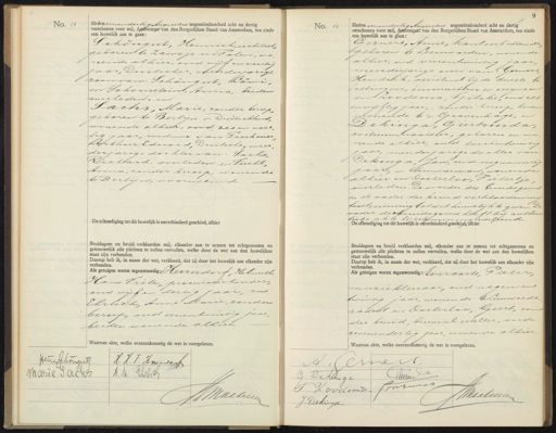 No. 15 Heden eenendertig Augustus negentienhonderd acht en dertig verschenen voor mij, Ambtenaar van den Burgerlijken Stand van Amsterdam, ten einde een huwelijk aan te gaan: Schongut, Heinrich, architect, geboren te Zawoje m Polen, wonende alhier, oud vijf en veertig jaar, Duitscher, meerderjarige zoon van: Schöngut, Lömi, en Schornstern, Arna, leiden overleden, is Tachs, Marie, zonder beroep, geboren te Berlijn —n Duitschland, wonende alhier, oud zes en veertig jaar, weduwe van Proskaner Arthur Eduard, Duitsche, meer derjarige dochter van: Tachs, Zichard, overleden en Fischt Arma, zonder beroep, wonende te Berlijn, voornoemd. De afkondiging tot dit huwelijk is onverhinderd geschied, alhier. Bruidegom en bruid. verklaarden mij, elkander aan te nemen tot echtgenooten en getrouwelijk alle plichten te zullen vervullen, welke door de wet aan den huwelijken staat zijn verbonden. Daarop heb ik, in naam der wet, verklaard, dat zij door het huwelijk aan elkander zijn verbonden. Als getuigen waren tegenwoordig Herrndorf, Helmuth Hans Tritz, procuratiehonder, oud vijf en dertig jaar, en Ehrlich, Anne Marie, zonder beroep, oud eenentintig jaar, beiden wonende alhier. Waarvan akte, welke overeenkomstig de wet is voorgelez No. 16 Heden eenendertig Augustus negentienhonderd acht en dertig verschenen voor mij, Ambtenaar van den Burgerlijken Stand van Amsterdam, ten einde een huwelijk aan te gaan: Gerners, Anne, kantoorbediende geboren te Leeuwarden, wonende alhier, oud vierentwintig jaar, meerderjarige zoon van: Gerners Hendrik, assistent bij de dueele be lastingen, invoerrechten en accynzer in Loodsma, Sjitske, oud zes envijftig jaar, - zonder beroep, beiden wonende t's. Gravenhage, en Dekinga, Geertruida, costuummaarster, geboren en wi nende alhier, oud toeeentwintig jaar, meerderjarige dochter van Dekinga, Jan, oud negenenveertig jaar — Timmerman, wonende alhier in Oosterloo, Pietertje, overleden De moeder des bruidegoms in de vader der bruid verklaarden mij toestemming tot dit huwelijk te geven. Di vader desberindegoms heeft by authen tieke akte toestemming verleend. De afkondiging tot dit huwelijk is onverhinderd geschied, alhier. Bruidegom en bruid verklaarden mij, elkander aan te nemen tot echtgenooten en getrouwelijk alle plichten te zullen vervullen, welke door de wet aan den huwelijken staat zijn verbonden. Daarop heb ik, in naam der wet, verklaard, dat zij door het huwelijk aan elkander zijn verbonden: Als getuigen waren tegenwoordig: Evernarts, Pieter muziekleeraar, oud negen en twintig jaar, wonende te Leeuwarde radeel en Oosterloo, Geert, oom x der bruid brievenbesteller, oude zevenendertig jaar wonende alhier perisschongers A:L.F: Hoerer A. M Ehre o Marie Tachs JMMactee A. Cerners. e G De Kinga Weuar HHoodond forsman Amaalenre J. Dekinga
