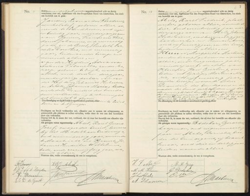 No. 11 Heden eenendertig uguilus negentienhonderd acht en dertig verschenen voor mij, Ambtenaar van den Burgerlijken Stand van Amsterdam, ten einde een huwelijk aan te gaan Jansen, Leonardus Theodorus, winkelchef, geboren alhier, wo¬ nende te Bindhoven, oud negen en twintig jaar, meerderjarige zoon van: Jansen, Franciscus Theo derus Johannes, oud zesenzestig jaar, in de Geest, Elisabeth Cor nelia Dorsthea, oud zesenzestig jaar, beiden zonder beroep en wonende alhier, en van der Heijden, Adrianu Antonia Petronella zonder be roep, geboren te Ewijk, wonende alhier, oud drie en dertig jaar, meerderjarige dochier van: van der Heijden, Johannes Huberlus en Ardts, Johanna Maria, beiden overleden. Doouders des bruide gours verklaarden ni toestemmingtot dit huwelijk te geven De afkondiging tot dit huwelijk is onverhinderd geschied, alhier en de bind hoven en te Nijmegen Bruidegom en bruid verklaarden mij, elkander aan te nemen tot echtgenooten en getrouwelijk alle plichten te zullen vervullen, welke door de wet aan den huwelijken staat zijn verbonden. Daarop heb ik, in naam der wet, verklaard, dat zij door het huwelijk aan elkander zijn verbonden. Als getuigen waren tegenwoordig: Absel, Karel Gerard Jozef, zwager der bruid leeraar bij het Middelbaar Onderwijs, oud zevenendertig jaar, wonende te Maastricht en Rerourt, Js- hannes Hendrikus Wilhelmus, bode, oud zesenvijftig jaar, wo¬ nende alhier Waarvan akte, welke overeenkomstig „de wet is voor: No. 12 Heden eenendertig Augustus negentienhonderd acht en dertig verschenen voor mij, Ambtenaar van den Burgerlijken Stand van Amsterdam, ten einde een huwelijk aan te gaan: Abels, Karel Fredirik, plaat„ welker, geboren alhier, wonende al hier, oud zesentwintig jaar, meer derjarige zoon van: Abels, Johannes Ludovieus oud tweeenzestig jaar bootuerker en Homan, Anna oud vijf enzestig jaar, zonder beroep beiden wonende alhier, en Kluuun, Margaretha Martina, zonder beroep, geboren en wonende alhier, oud negentien jaar, minderjarige dochier van Klinu, Jan Geerling over leden en Griep, Martina Ma- ria, oud vijf enveertig jaar, zonder beroep, wonende alhier. De ouders des bruidegomsen d moeder der bruid verklaarden mij toe stemming tot dit huwelijk tegeven Be voogd der bruid met name: Griep, Willem Andries Hugo, heier, wonende alhier, heeft bij au hentieke akte toestemming verleend. De afkondiging tot dit huwelijk is onverhinderd geschiedafhier Bruidegom en bruid verklaarden mij, elkander aan te nemen tot echtgenooten en getrouwelijk alle plichten te zullen vervullen, welke door de wet aan den huwelijken staat zijn verbonden. Daarop heb ik, in naam der wet, verklaard, dat zij door het huwelijk aan elkander zijn verbonden. Als getuigen waren tegenwoordig: Bödeker Gerardus koopiman, oud negenenveertig jaar in Abels, Cornelis, broe„ der des baur degoms, rijksammb tenaar, oud drie en dertig jaar beiden wonende alhier. Waarvan akte, welke overeenkomstig de wet is voorgelezen. JJanses KGt Abril J.J.T. V.d. Heijden Wesement 6 . Jnoen Imaat E C D de Geert K.T Mbel M: M. Jriep M M. Kluun G Bödaker CAbe J Lobels JMaali A Homen