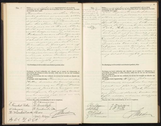 No. 13 Heden eenendertig Augentig negentienhonderd acht en dertig verschenen voor mij, Ambtenaar van den Burgerlijken Stand van Amsterdam, ten einde een huwelijk aan te gaan: Kromhout van der Meer, Evert venter, geboren in wonende alhier, oud negenentwintig jaar, meer. derjalige zoon van Kiomhout van der Meer, Hille, oud achten zestig jaar, in de Raat, Alberdina, oud zesenzestig jaar, beiden zonder beroep en wonende alhier, en Schuurman, Neeltje, zonder beroep, geboren en wonende alhier, oud drie en twintig jaarmeerderjarige dochter van Schuurman, George, oud vijf tig jaar, sigarenmaker, Corneliaie, Paartje, oud vyf en veertig jaar, zonder beroep, beiden winende alhier. Dirder ouders verklaarden mij toestemming tot dit huwelijk te geven. De afkondiging tot dit huwelijk is onverhinderd geschied, alhier Bruidegom en bruid verklaarden mij, elkander aan te nemen tot echtgenooten en getrouwelijk alle plichten te zullen vervullen, welke door de wet aan den huwelijken staat zijn verbonden. Daarop heb ik, in naam der wet, verklaard, dat zij door het huwelijk aan elkander zijn verbonden. Als getuigen waren tegenwoordig: Kromhout van der Meer Hille, broeder des brundig oms, timmerman, en Seljee, Pieser Hendrik Jacobus, zwager des bruidegoms, koopman, beiden een en veertig jaar oud en no nende alhier Waarvan akte, welke overeenkomstig de wet is voorgelezen. N 19 van Gustitie van 40. & bevel van de opver augastus 1989 is de Adlachtstaam van de zuid en de vader van beuid verbeterd in Peci Ansterdam, 16 augustus 10/ no J vO Heden eenendertig Augistis negentienhonderd acht en dertig een huwelijk aan te gaan: verschenen voor mij, Ambtenaar van den Burgerlijken Stand van Amsterdam, ten einde van stegeren, Cornelis Antonius, Timmerman, geboren en wonend alhier, oud zesentwintig jaar, meer derjarige zoon van van Stegeren; Gerrit Bernardus, en Veltman, Maria Catharma, beiden overleden, en Piek, Helena Maria, zonder beroep, geboren en wonende alhier oud vijf en twintig jaar meerderjarige dochter van: Tiek, Guvrinus, oud tweeënzestig jaar, kantoorbediende en Pieman Giesberta Cirema oud acht en vijftig jaar, zonder beroep, beiden wonende alhier. Deouders der bruid verklaarden mij toeslem. ming tot dit huwelijk te geven De afkondiging tot dit huwelijk is onverhinderd geschied, alhier. Bruidegom en bruid verklaarden mij, elkander aan te nemen tot echtgenooten en getrouwelijk alle plichten te zullen vervullen, welke door de wet aan den huwelijken staat zijn verbonden. Daarop heb ik, in naam der wet, verklaard, dat zij door het huwelijk aan elkander zijn verbonden. Als getuigen waren tegenwoordig: Witjes, Johannes Vredericus zwager des bruidegom agent van politie oudvyf en veertig jaar en Piek, Frederi cus Johannes Maria, broeder der bruid, schilder oud een en dertig jaar beiden wonende alhier Waarvan akte, welke overeenkomstig de wet is voorgelezen. CJ. Schuurman C Kroonhorst v/d Meee A. Cornelisse. H Kromherct &Mee N. Schuurman H. Kromhoet van der Sleeer WMaaleeneen AuJ Seljer AOCV O C J Fulitjes A: v Stegen JF Ziek HM Piek D iek Maateeeur G C Gieman