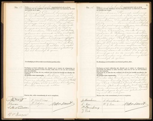 No. 15 Heden een en dertig Augustus negentienhonderd acht en dertig verschenen voor mij, Ambtenaar van den Burgerlijken Stand van Amsterdam, ten einde een huwelijk aan te gaan: Dragt Gerrit koopman, geboren te Zuidwolde, wonende alhier oud vijf en veertig jaar van echt gescheiden echtgenoot van: Koers, Albertina meer¬ derjarige zoon van: Dragt Harm en Mennink, Jentje beiden zonder beroep en wonende te de Wijk en Naarden Rachel zonder beroep, geboren en wonende alhier oud negentien jaar, minderjarige dochter van: Naarden, Simon oudnegen en vijftig jaar, colporteur en van Bever Naatje oud een en zestig jaar, zonder beroep beiden wonende alhier. De ouders der bruid verklaarden mij toestemming tot dit huwelijk te geven. De afkondiging tot dit huwelijk is onverhinderd geschied, alhier. Bruidegom en bruid verklaarden mij, elkander aan te nemen tot echtgenooten en getrouwelijk alle plichten te zullen vervullen, welke door de wet aan den huwelijken staat zijn verbonden. Daarop heb ik, in naam der wet, verklaard, dat zij door het huwelijk aan elkander zijn verbonden. als getuigen waren tegenwoordig: Mobron Cornelis Joannes Antonius, kleermaker oud vier en dertig jaar en Ootjers Hendrik chanffeur, oud acht en twintig jaar beiden wonende alhier. Waarvan akte, welke overeenkomstig de wet is voorgelezen. No. 16. Heden een en dertig Augustus negentienhonderd acht en dertig verschenen voor mij, Ambtenaar van den Burgerlijken Stand van Amsterdam, ten einde een huwelijk aan te gaan: Brinkman, Hannes werkman, ge boren en wonende alhier, oud vijf en twintig jaar meerderjarige zoon van Brinkman, Bartholomeus, oud zestig jaar, — harenarbeider en Deggerda B ietje, oud negen en vijftig jaar, zonder beroep beiden wonende alhier en Ras, Cornelia, zonder beroep, geboren te Velsen wonende alhier, oud zes en twintig jaar, meerderjarige dochter van: Kas, Gerrit, wiensbestaan of verblijf onzeker is, zoodat hij wordt geacht ten opzichte van dit huwelijk zijn wil niet te kunnen verklaren en Post Jannetje oud een en zestig jaar, zonder beroep wonende alhier. De ouders des bruidegoms en de moeder der bruid, verklaarden mij toestemming tot dit huwelijk te geven. De afkondiging tot dit huwelijk is onverhinderd geschied, alhier, Bruidegom en bruid verklaarden mij, elkander aan te nemen tot echtgenooten en getrouwelijk alle plichten te zullen vervullen, welke door de wet aan den huwelijken staat zijn verbonden. Daarop heb ik, in naam der wet, verklaard, dat zij door het huwelijk aan elkander zijn verbonden. dis getuigen waren tegenwoordig: Brinkman Bartholomeus broeder des bruidegoms venter, oud zeven en twintig jaar, wonende alhier en Kas Willem Gerrit, broeder der bruid, fabrieksarbeider, oud vijf en dertig jaar wonende te Casticum, De moeder des bruidegoms heeft niet geteekend, omdat zij niet kon schrijven. Waarvan akte, welke overeenkomstig de wet is voorgelezen. Mrag C mobton 2 H Ootjers Van soest. B Waarden I Me Naarden N V Buzer J Brinkman B. Brinkman vansoest W.G. Kas. C Kas B Brinkma J Port