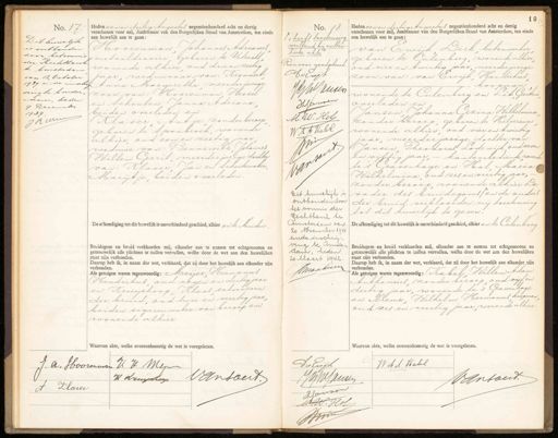 No. 17 No. 17 Dit huwelijk is ontbonden door het vonnis der Rechttank te Amsterdam van 12 October 1939 en de mschr ving te ponder„ „dan, heden 9 Decembr 1939 PRuun Heden een en dertig Augustus negentienhonderd acht en dertig verschenen voor mij, Ambtenaar van den Burgerlijken Stand van Amsterdam, ten einde een huwelijk aan te gaan: Hoorenman Johannes Adrianus metaaldraaier geboren te Utrecht. wonende alhier oud drie en zestig jaar, weduwnaar van: Krommert Anna Margaretha meerderjarige zoon van: Hoorenman, Wessel en Schouten Janna Adriana beiden overleden en Klaver Antje zonder beroep geboren te Spanbroek, wonende alhier oud een en zestig jaar weduwe van: Bennewitz Johannes Willem Gerrit, meerderjarige dochter van: Klaver Jan en Schuitemaker Marijtje beiden overleden. De akkondiging tot dit huwelijk is onverhinderd geschied, alhier en te Muiden Bruidegom en bruid verklaarden mij, elkander aan te nemen tot echtgenooten en getrouwelijk alle plichten te zullen vervullen, welke door de wet aan den huwelijken staat zijn verbonden: Daarop heb ik, in naam der wet, verklaard, dat zij door het huwelijk aan elkander zijn verbonden. Als getuigen waren tegenwoordig: Meijer, Hermanus Hendrikus, oud negen en destig jaar en Kruyshoop, Klaas schoonzoon der bruid, oud twee en veertig jaar, beiden sigarenmaker van beroep en wonende alhier. Waarvan akte, welke overeenkomstig de wet is voorgelezen. No. 18. ¶, heeft toestemning verleend bij authen- O4 Piete akte Renvoor goedgekeurd. Adwijk GGWJansen IhCaroen M.W. Hol WF H Kabl 1 C J W Dit huwelijk is ontbouden door het kannis der Rechtbank te Amsterdam van 20 November 1941 en de inschrij„ ving te Amster¬ dam, heden 20 Faart 1942. Jmaateum IhCaroen M.W. Hol WF H Kabl 1 C 14 W Dit huwelijk is ontbouden door het kannis der Rechtbank te Amsterdam van 20 November 1941 en de inschrij„ ving te Amster¬ dam, heden 20 Faart 1942. maatinn Heden een en dertig Augustus negentienhonderd acht en dertig verschenen voor mij, Ambtenaar van den Burgerlijken Stand van Amsterdam, ten einde een huwelijk aan te gaan: van Cwijk Dirk betonwerker geboren te Culemborg, wonende alhier oud vier en twintig jaar, meerderjarige zoon van: van Ewijk, Hendrikus J- koopman wonende te Culemborg en Zit Geertrui overleden en Jansen Johanna Cezina Wilhelmina zonder beroep, geboren te Hilversum wonende alhier oud vier en twintig jaar, meerderjarige dochter van: Jansen Theodorus Lodewijk oud zeven en vijftig jaar, — kantoorbediende wonende te 's Gravenhage en Hol, Maria Wilhelmina oud zes en veertig jaar, zonder beroep wonende alhier De vader des bruidegoms/en de ouders der bruid verklaarden mij toestemming tot dit huwelijk te geven. De afkondiging tot dit huwelijk is onverhinderd geschied, alhier en te Culemborg "Bruidegom en bruid verklaarden mij, elkander aan te nemen tot echtgenooten en getrouwelijk alle plichten te zullen vervullen, welke door de wet aan den huwelijken staat zijn verbonden. Daarop heb ik, in naam der wet, verklaard, dat zij door het huwelijk aan elkander zijn verbonden. dds getuigen waren tegenwoordig: Kabel Willem Adam Anthonius, zonder beroep, oud vijf en dertig jaar, wonende te 's Gravenhage en Nieme, Wilhelm Hermanus koopman oud zes en veertig jaar, wonende alhier Waarvan akte, welke overeenkomstig de wet is voorgelezen. J. A. Hboorenman H H Meyn Vansoert H druysrerp Klarer