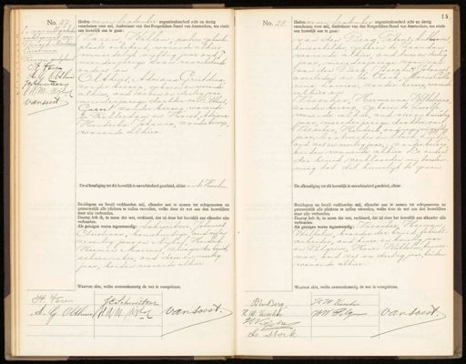NO. 27 No. 27. 1 „ van echt gescheiden echtgenoot van Benard, Nicolatina Cantranc Renvooi goedgekeurd. H. Jelen A.G. Olthuis Je Sehweekers HHM. Nijhof vanboest. Heden zeven september negentienhonderd acht en dertg verschenen voor mij, Ambtenaar van den Burgerlijken Stand van Amsterdam, ten einde en een huwelijk aan te gaan: Varen, Willem; portier geboorte plaats onbekend, wonende alhier meerderjarige zoon van onbekende vermoedelijk vijftig jaar oud ouders en Olthuis, Adriana Gerritdina zonder beroep, geboren en wonende alhier, oud zeven en dertig jaar meerderjarige dochter van: Olthuis Garrit zonder beroep wonende te Rotterdam en Horst, Adriana Hendrika Johanna zonder beroep, wonende alhier. De afkondiging tot dit huwelijk is onverhinderd geschied, alhier en te Haarlem. Bruidegom en bruid verklaarden mij, elkander aan te nemen tot echtgenooten en getrouwelijk alle plichten te zullen vervullen, welke door de wet aan den huwelijken staat zijn verbonden. Daarop heb ik, in naam der wet, verklaard, dat zij door het huwelijk aan elkander zijn verbonden. Als getuigen waren tegenwoordig: Schweitzer, Johannes Christiaan, bouwkundige oud vijfen zeventig jaar en Nijhof Hendrik Herman Marinus zwager der bruid, schoenmaker, oud drie en veertig jaar, beiden wonende alhier. Waarvan akte, welke overeenkomstig de wet is voorgelezen. No. 28. Heden zeven September negentienhonderd acht en dertig verschenen voor mij, Ambtenaar van den Burgerlijken Stand van Amsterdam, ten einde een huwelijk aan te gaan: van den Berg Petrus Anthonius huisschilder, geboren te Zaandam wonende alhier oud twee en dertig jaar, meerderjarige zoon van van den Berg Josephus Johannes overleden en de Kock Maria Catha rina Louisa, zonder beroep, wonende alhier en Visscher, Hermanna Wilhelmina zonder beroep geboren te Zwolle wonende alhier, oud vier en twintig jaar, meerderjarige dochter van Visscher, Hendrik, oudnegen en vijftig jaar,bootwerker en stork Luitje oud zes en veertig jaar, - zonder beroep beiden wonende alhier De ouders der bruid verklaarden mij toestem ming tot dit huwelijk te geven. De afkondiging tot dit huwelijk is onverhinderd geschied, alhier. Bruidegom en bruid verklaarden mij, elkander aan te nemen tot echtgenooten en getrouwelijk alle plichten te zullen vervullen, welke door de wet aan den huwelijken staat zijn verbonden. Daarop heb ik, in naam der wet, verklaard, dat zij door het huwelijk aan elkander zijn verbonden. dis getuigen varen tegenwoordig: Visscher Herman. Wilhelm broeder der bruid, fabrieks arbeider, oud twee en twintig jaar en Pelgrim, Henri Wilhelm, timmer, man, oud zes en dertig jaar, beiden wonende alhier. Waarvan akte, welke overeenkomstig de wet is voorgelezen. H Taren. JC. Schweitzer van soest. A. G. Olthuisf ft H M Jhof HW Veuhel Pchra Berg. WW Selg Van soest H.W. Usscher WWissche L Stork