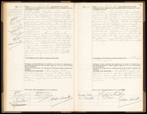 Heden zeven september negentienhonderd acht en dertig verschenen voor mij, Ambtenaar van den Burgerlijken Stand van Amsterdam, ten einde een huwelijk aan te gaan: Holtz Johan Leonard klerk bij het gemeente girokantoor oud een en twintig jaar meerder- geboren te Hatten wonende alhier jarige zoon van: Holtz Hendrik Jacobus (boekhouder en schuwer Hillegonda oud twee en vijftig jaar zonder beroep beiden wonende alhier en Krienen Maria Gerrite tijpiste, geboren te 's Gravenhoge wonende alhier, oud zes en dertig jaar, meerderjarige dochter van Krienen Charles zonder beroep wonende alhier en Schild Sophia Maria overleden. De ouders des bruidegoms verklaarden mij toestemming tot dit huwelijk te geven. De afkondiging tot dit huwelijk is onverhinderd geschied, alhier, Bruidegom en bruid verklaarden mij, elkander aan te nemen tot echtgenooten en getrouwelijk alle plichten te zullen vervullen, welke door de wet aan den huwelijken staat zijn verbonden. Daarop heb ik, in naam der wet, verklaard, dat zij door het huwelijk aan elkander zijn verbonden. Als getuigen waren tegenwoordig: Haantjes Johan kantoorbediende, oud acht en dertig jaar en Faber, Johannes bode, oud drie en vijftig jaar, beiden wonende alhier. Waarvan akte, welke overeenkomstig de wet is voorgelezen. No. 30 Heden zeven september negentienhonderd acht en dertig verschenen voor mij, Ambtenaar van den Burgerlijken Stand van Amsterdam, ten einde een huwelijk aan te gaan: Matz Lndolf, huisschilder geboren te Geldern in Duitschland wonende alhier, oud een en dertig jaar, Duitscher meerderjarige zoon van: Katz Salomon, koopman wonende te Geldern voornoemd en Wiesenfelder, Bertha, overleden en Neuseld Herta, zonder beroep geboren te Calcar in Duitschland wonende alhier, oud acht en twintig jaar, Duitsche, meerderjarige dochter van: Vijfh Julius en Metzijer, Henriette, beiden overleden De nondiging tot dit huweijk is onverhinderd geschied, alhier en te Hengels in Overijssel. Bruidegom en bruid verklaarden mij, elkander aan te nemen tot echtgenooten en getrouwelijk alle plichten te zullen vervullen, welke door de wet aan den huwelijken staat zijn verbonden. Daarop heb ik, in naam der wet, verklaard, dat zij door het huwelijk aan elkander zijn verbonden. dis getuigen waren tegenwoordig: Neufeld, Siegftied koopman oud drie en vijftig jaar en Cans, Alexander, tandtechnical oud acht en twintig jaar, beiden wonende alhier. Waarvan akte, welke overeenkomstig de wet is voorgelegen. Jaen J J — x Jaant van Soest. Lltr Hoschuwer Diegfiej Neufe Ludalf Rakz. AJans. H. Heufeld van soest.