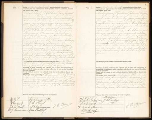 No.1 Heden vijf en twintig Augustus negentienhonderd acht en dertig verschenen vóor mij, Ambtenaar van den Burgerlijken Stand van Amsterdam, ten einde een huwelijk aan te gaan: Bolthof Willem Jan kommiel der directe belastingen, invoerrechten en accunzen, geboren te Leeuwarderadeel wonende te Beek, oud vier en twintig jaar, meerderjarige zoon van: Bolthof, Jan Hendrik, oud twee en vijftig jaar, — assistent.- opzichter bij de Nederlandsche spoorwegen en Lammers Hermina Johanna oud vijftig jaar, — zonder beroep. beiden wonende alhier en Bruggenwirth Francilca Anthonia zonder beroep, geboren en wonende alhier oud twee en twintig jaar, meerderjarige dochter van: Bruggen. wirth Leendert Johannes Antonie ou negen en veertig jaar,- koopman en Fluijt, Joanna Maria oud vier en vijftig jaar, — zonder beroep, beiden wonende alhier. De afkondiging tot dit huwelijk is onverhinderd geschied, alhier en te Beek. Beider ouders verklaarden my toestem. ming tot dit huwelijk te geven Bruidegom en bruid verklaarden mij, elkander aan te nemen tot echtgenooten en getrouwelijk alle plichten te zullen vervullen, welke door de wet aan den huwelijken staat zijn verbonden. Daarop heb ik, in naam der wet, verklaard, dat zij door het huwelijk aan elkander zijn verbonden. Als getuigen waren tegenwoordig: Kunnen Pieter Christianus adjunct- commies bij de directe belastingen en accijnzen, oud vijf en veertig jaar wonende te Haarlem en Bolthof Hernanes oom des bruidegoms zonder beroep oud zestig jaar, wonende te Leeuwarderadeel. Waarvan akte, welke overeenkomstig de wet is voorgelezen. No. 2 Heden vijf en twintig Augustus negentienhonderd acht en dertig verschenen voor mij, Ambtenaar van den Burgerlijken Stand van Amsterdam, ten einde een huwelijk aan te gaan: Schrijver, Hendricus Johannes Pieter winkelier, geboren en wonende alhier oud vier en twintig jaar, meerder jarige zoon van: Schrijver, Franciscus overleden en van der Meer, Hendrika Anna, oud vijftig jaar, — zonder beroep, wonende alhier en van de Groep Anthonia zonder beroep, geboren en wonende alhier oud zeven en twintig jaar, meerder jarige dochter van: van de Groep Barend oud twee en vijftig jaar, - drogist 0 wonende alhier en Prk Neeltje overleden. De moeder des bruidegams en de vader der bruid verklaarden mij toestemming tot dit huwelijk te geven. De afkondiging tot dit huwelijk is onverhinderd geschied, alhier. Bruidegom en bruid verklaarden mij, elkander aan te nemen tot echtgenooten en getrouwelijk alle plichten te zullen vervullen, welke door de wet aan den huwelijken staat zijn verbonden. Daarop heb ik, in naam der wet, verklaard, dat zij door het huwelijk aan elkander zijn verbonden. Als getuigen waren tegenwoordig: Schrijver Hendricus neef des bruidegoms, koopman oud vier en twintig jaar en van de Groep Johanna Margaretha Elisabeth; zuster der bruid, droguste oud vijf en twintig jaar, beiden wonende alhier. Waarvan akte, welke overeenkomstig de wet is voorgelezen. Bolk K J J A Bruysenuitt J. V. Briggene JM. Sluyt J RMluwe K Komn JH Buchf HJ. Lammerd Hoon, volof H. Schrijver 1 H C Schrijven J Kb vo Groef J R Moo A v. L. Groeff H. A. van der Meer B re Greepse