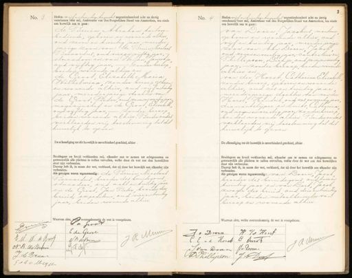 No. 3 Heden vijf en twintig Augustus negentienhonderd acht en dertig verschenen voor mij, Ambtenaar van den Burgerlijken Stand van Amsterdam, ten einde een huwelijk aan te gaan: de Bruin Abraham kantoor bediende, geboren en wonende alhier, oud zeven en twintig jaar meerder. jarige zoon van: de Bruin Nicolaas Bernardus, oud vier en vijftig jaar, stucadoor en van Weyjen, Jannetje oud vijftig jaar, zonder beroep, beiden wonende alhier en de Groot, Elizabeth Maria Wilhelmina zonder beroep geboren en wonende alhier oud vijf en twintig jaar meerderjarige dochter van: de Groot, Pieter oud zeven en veertig jaar, magazijnchef en de Groot Elisabeth oud vijftig jaar, zonder beroep beiden wonende alhier. Beider ouders verklaarden mij toestemming tot dit huwelijk te geven. De afkondiging tot dit huwelijk is onverhinderd geschied, alhier. Bruidegom en bruid verklaarden mij, elkander aan te nemen tot echtgenooten en getrouwelijk alle plichten te zullen vervullen, welke door de wet aan den huwelijken staat zijn verbonden. Daarop heb ik, in naam der wet, verklaard, dat zij door het huwelijk aan elkander zijn verbonden. Als getuigen waren tegenwoordig: de Bruin Nicolaas Bernardus, broeder des bruidegoms stucadoor, oud acht en twintig jaar en de Groot, Jan Pieter broeder der bruid, expediteur oud vier en twintig jaar, beiden wonende alhier. No. 4. Heden vijf en twintig Augustus negentienhonderd acht en dertig verschenen voor mij, Ambtenaar van den Burgerlijken Stand van Amsterdam, ten einde een huwelijk aan te gaan: van Doorn (Jacobus monteur geboren en wonende alhier oud vijf en twintig jaar, meerderjarige zoon van: van Doorn, Jacob oud zeven en veertig jaar,- controleur en Phillipson, Dirkje, oud zeven en veertig jaar, — zonder beroep, beiden wonende alhier en van der Horst, Catharina Elisabeth zonder beroep, geboren en wonende alhier, oud zes en twintig jaar, meerderjarige dochter van: van der Horst Hendrik, oud zes en veertig jaar diamantslijper en Smits Catharina oud negen en veertig jaar, zonder beroep beiden wonende alhier. Beider ouders verklaarden mij toestemming tot dit huwelijk te geven. De afkondiging tot dit huwelijk is onverhinderd geschied, alhier, Bruidegom en bruid verklaarden mij, elkander aan te nemen tot echtgenooten en getrouwelijk alle plichten te zullen vervullen, welke door de wet aan den huwelijken staat zijn verbonden. Daarop heb ik, in naam der wet, verklaard, dat zij door het huwelijk aan elkander zijn verbonden. Ais getuigen waren tegenwoordig: van Doorn, Jacob broeder des bruidegoms oud twee en twintig jaar en van Dort, Jacob zwager der bruid, oud drie en twintig jaar, beiden metaalbewerker van beroep en wonende alhier. Waarvan akte, welke overeenkomstig de wet is voorgelezen. et is voorgelezen. Pa Groot v 82 Minu E de Geort rM. W. de Groof JR JB dooren N.B. de Bruin I. de J de Braar Gob v Weiden ap v7 Jo DoornW. 18 Houf J A Omm C E „ d Horst C Suit J van Doorn Jo. Doorn. D Phillipson J & Dors