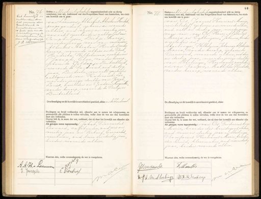 Nv. 76. Dit huwelijk is ontbonden door het vormis der Pechtbank te Amsterdam van 10 Juli 1940 en de inschrijving te Amsterdam, heden 14 Augustus 1960 J Acmm Heden acht en twintig september negentienhonderd acht en dertig verschenen voor mij, Ambtenaar van den Burgerlijken Stand van Amsterdam, ten einde een huwelijk aan te gaan: van Leeuwen Albertus Abraham Hendrik, propagandist, geboren en wonende alhier oud zeven en veertig jaar van echt gescheiden echtgenoot van Camphuysen Dirkje Maria meerderjarige zoon van: van Leeuwen Albertus Abraham Hendrik zonder beroep, wonende alhier en ter Beek Hendrika Wilhelmina overleden en Joseph, Else, zonder beroep geboren te Goldap in Duitschland, wonende te Zandvoort, oud dertig jaar Duitsche, van echt gescheiden echtgenoote van: Radinowski Leo meerderjarige dochter van: Joseph, Louis, overleden en Grodzin Maraeethe zonder beroep, wonende te Berlijn in Duitschland. De afkondiging tot dit huwelijk is onverhinderd geschied, alhier en te Zandvoort: Bruidegom en bruid verklaarden mij, elkander aan te nemen tot echtgenooten en getrouwelijk alle plichten te zullen vervullen, welke door de wet aan den huwelijken staat zijn verbonden. Daarop heb ik, in naam der wet, verklaard, dat zij door het huwelijk aan elkander zijn verbonden. als getuigen waren tegenwoordig: Jobst, Bernardus Leonard, caséhouder, oud zes en veertig jaar en Verhoef Everardus werkman oud twee en dertig jaar beiden wonende alhier. Waarvan akte, welke overeenkomstig de wet is voorgelezen. No. 77 Heden acht en twintig september negentienhonderd acht en dertig een huwelijk aan te gaan: verschenen voor mij, Ambtenaar van den Burgerlijken Stand van Amsterdam, ten einde van Os. Joannes Henricus Maria winkelchef, geboren en wonende alhier, oud acht en dertig jaar meerderjarige zoon van: van Os Henri Alphonsus Maria en Egthuijsen, Johanna, beiden overleden en Stoelinga Wilhelmina Johanna Alphonsa Maria, zonder beroep, geboren te Purmerend, wonende alhier oud drie en dertig jaar, meerderjarige dochter van: Stoelinga, Hermanus overleden, en van Kampen, Mathilda Hendrika zonder beroep, wonende alhier. De afkondiging tot dit huwelijk is onverhinderd geschied, alhier. Bruidegom en bruid verklaarden mij, elkander aan te nemen tot echtgenooten en getrouwelijk alle plichten te zullen vervullen, welke door de wet aan den huwelijken staat zijn verbonden. Daarop heb ik, in naam der wet, verklaard, dat zij door het huwelijk aan elkander zijn verbonden. Als getuigen waren tegenwoordig: van Os Fredericus Anne Marie, broeder des bruidegoms etaleur oud zeven en dertig jaar en stoelinga Bonifacius Hermanus Marie, broeder, der bruid, kleermaker oud vier en dertig jaar, beiden wonende alhier. Waarvan akte, welke overeenkomstig de wet is voorgelezen. A.A. H. & Leeuwen N E. Verhoef. E. Juseph TMarr Os JAmvand. WJ M. Stoelingg B H. d Sloelinge „
