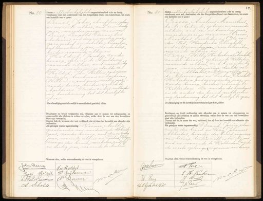 No. 80. Heden acht en twintig September negentienhonderd acht en dertig verschenen voor mij, Ambtenaar van den Burgerlijken Stand van Amsterdam, ten einde een huwelijk aan te gaan Leenes John, chauffeur geboren en wonende alhier oud een en twintig jaar, meerderjarige zoon van Leenes Zeopold Bernardus Antonius oud drie en veertig jaar garagechef en Scholte Ariaantje oud twee en veertig jaar, — zonder beroep, beiden wonende alhier en Holdijk, Jantje, zonder beroep, geboren te Apeldoorn wonende alhier, oud vier en twintig jaar meerderjarige dochter van Holdijk, Jan Willem opdvier en zestig jaar werkman en Spijkerman Willemina oud een en zestig jaar. zonder beroep beiden wonende te Apeldoorn. Beider ouders verklaarden mij toestemming tot dit huwelijk te geven De afkondiging tot dit huwelijk is onverhinderd geschied, alhier. Bruidegom en bruid verklaarden mij, elkander aan te nemen tot echtgenooten en getrouwelijk alle plichten te zullen vervullen, welke door de wet aan den huwelijken staat zijn verbonden. Daarop heb ik, in naam der wet, verklaard, dat zij door het huwelijk aan elkander zijn verbonden. Als getuigen waren tegenwoordig: Roemer Neeltje grootmoeder van moederszijde desbruide- goms, zonder beroep oud drie en zestig jaar, wonende alhier en Postma Wieger zwager der bruid, winkelier, oud vijf en dertig jaar, wonende te Arnhem„ Waarvan akte, welke overeenkomstig de wet is voorgelezen. No. 81. Heden acht en twintig september negentienhonderd acht en dertig verschenen voor mij, Ambtenaar van den Burgerlijken Stand van Amsterdam, ten einde een huwelijk aan te gaan: Croese Anelius Mauritius kantoorbediende, geboren en wonende alhier, oud een en twintig jaar meerderjarige zoon van Croese Nicolaas overleden en Cötz van der Vet Hendrika Elisabeth oud acht en veertig jaar, winkelierster wonende alhier en Bezij Willy Hubertina Elisabeth zonder beroep, geboren te Rotterdam wonende alhier oud twee en twintig jaar, meerderjarige dochter van Pezij Albertus oud drie en vijftig jaar handelsreiziger en Vinken Cusabeth Hubertina oud een en zestig jaar, zonder beroep beiden wonende te Rotterdam. De moeder des bruidegomb en de ouders der bruid verklaarden mij toestemming tot dit huwelijk te geven De afkondiging tot dit huwelijk is onverhinderd geschied, alhier. Bruidegom en bruid verklaarden mij, elkander aan te nemen tot echtgenooten en getrouwelijk alle plichten te zullen vervullen, welke door de wet aan den huwelijken staat zijn verbonden. Daarop heb ik, in naam der wet, verklaard, dat zij door het huwelijk aan elkander zijn verbonden. ds getuigen warten tegenwoordig: Brand, Jorine schoon zuster der bruid en Pezi Johannes Albertus broeder der bruid ingenieur van beroep, beiden acht en twintig jaar oud en wonende te Rotterdam zijnde de eerste getuige ingenieur van beroep Waarvan akte, welke overeenkomstig de wet is voorgelezen. Jolu Ceen JW Holdhijk 1 W Spijkerman Juutje Holdijk 0 L.BA. Reeu A Loewer A. Scholte Ambroe A. Verr: