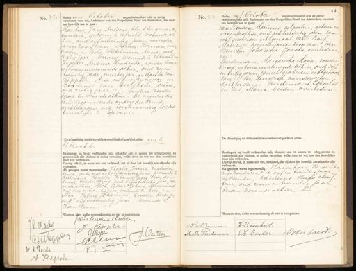 No. 82 Heden een October negentienhonderd acht en dertig verschenen voor mij, Ambtenaar van den Burgerlijken Stand van Amsterdam, ten einde- een huwelijk aan te gaan: Markus, Jan Antoon klerk ter gemeente„ secretarie, geboren te Utrecht, wonende al„ hier oud vijf entwintig jaren meerder„ jarige zoon van: Markus, Herman, over„ leden, en Poels Wilhelmina Anna oud zestig jaar secrares wonende te Utrecht en Keppler, Antonia Hendrika, zonder beroep geboren en wonende alhier oud zes en twintig Jaar meerderjarige dochter Van: Keppoer, Arie, oud eenenzestig jaar en Bterdenis van Berlekom, Josina oud zestig jaar,, beiden zonder beroep en wonende alhier. De moeder des bruidegomsende onders der bruid verklaarden mij toestemming tot dit huwelijk te geven. De afkondiging tot dit huwelijk is onverhinderd geschied, alhier een te Utrecht. Bruidegom en bruid verklaarden mij, elkander aan te nemen tot echtgenooten en getrouwelijk alle plichten te zullen vervullen, welke door de wet aan den huwelijken staat zijn verbonden. Daarop heb ik, in naam der wet, verklaard, dat zij door het huwelijk aan elkander zijn verbonden. Als getuigen waren tegenwoordig: Keppler, Josina, Zuster der bruid, arts oud acht entwintig jaar wonende te Rotterdam Keppler Johann Georg broer der bruid, zonder beroep, oud vijfentwintig jaar, wo„ nende alhier Blok, Gerard Johan Lavocaat, oud vier entwintig jaar wonende te Ede en Mey Petrus Johannes zonder beroep oud vijf entwintig jaar, wonende te Kampen Waarvan ate, welke overeenkomstig de wet is voorgelezen. No. 83 Heden vijf October negentienhonderd acht en dertig verschenen voor mij, Ambtenaar van den Burgerlijken Stand van Amsterdam, ten einde een huwelijk aan te gaan: van Buuren, Marinus colporteur, geboren en wonende alhier, oud achtendertig jaren van echt gescheiden echtgenoot van: Boef¬ Marrigje meerderjarige zoon van: 1 Jan Buuren, Johanna Jacoba, overleden en Peerdeman, Margaretha Maria, zonder beroep, geboren en wonende alhier oud vijf en dertig jaren, van echt gescheiden echtgenoote Van 7os, Hendrik meerderjarige dochtervan: Peerdeman, Cornelis en Vet, Maria, beiden overleden De afkondiging tot dit huwelijk is onverhinderd geschied, alhier Bruidegom en bruid verklaarden mij, elkander aan te nemen tot echtgenooten en getrouwelijk alle plichten te zullen vervullen, welke door de wet aan den huwelijken staat zijn verbonden. Daarop heb ik, in naam der wet, verklaarddat zij door het huwelijk aan elkander zijn verbonden. dls getuigen waren tegenwoordig: Haarekost Hendrika cafehoudster, oud vijf en twintig jaar en Bender, Ednmnd Hugs, chauf„ feur, oud zeven en twintig jaar beiden wonende alhier Waarvan akte, welke overeenkomstig de wet is voorgelezen. ttme voerdeuid T Berlekon L. dosker Keppler Gukepen J. Oenteen AMappeln Cuns PJ Coer W.E Voels A Zeppie A v Buure H. Haarekort. van soest. EH Bender M. M. Peerdeman